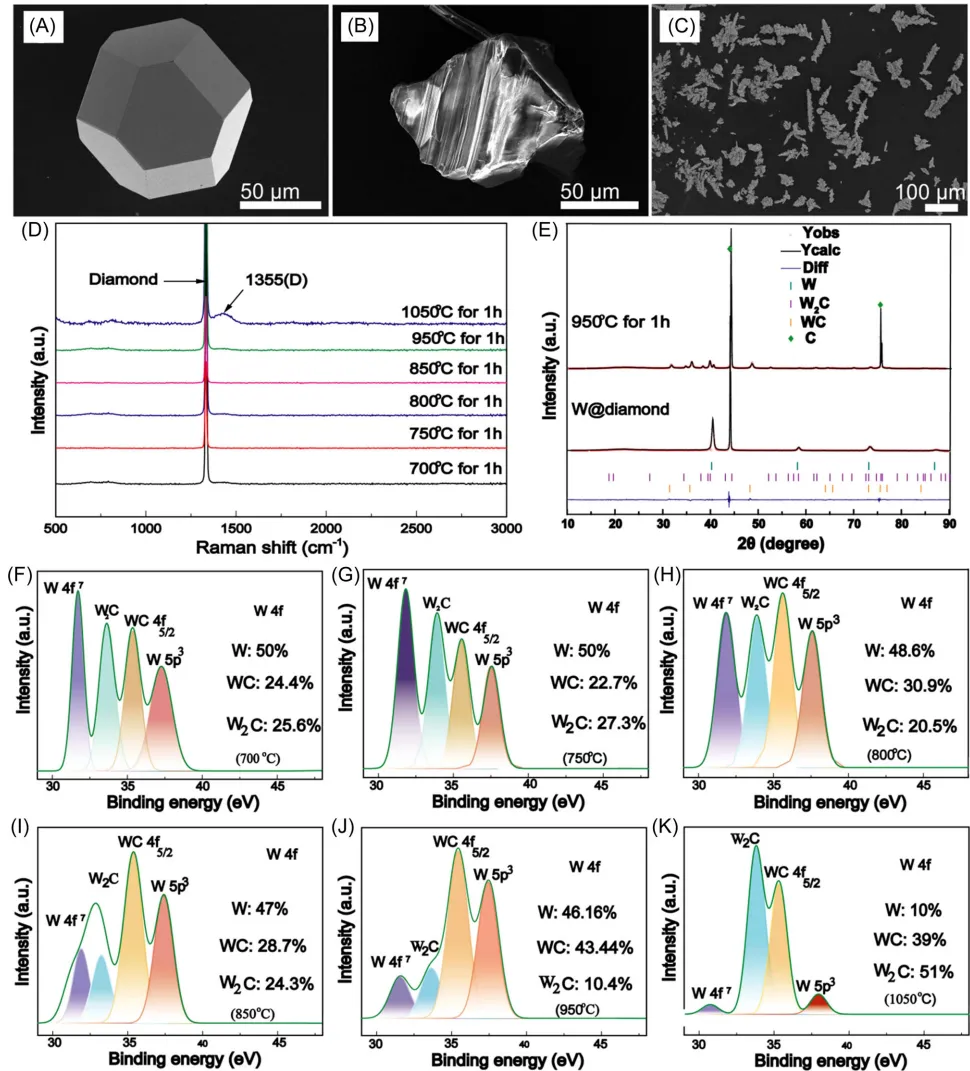 热处理后,金刚石表面形成W-WC-W₂C梯度层。XPS分析显示,950°C时涂层中W、WC、W₂C含量分别为46.16%、43.44%和10.4%。拉曼光谱证实,改性后金刚石石墨化温度升高至1050°C以上,涂层有效抑制了金刚石相变。