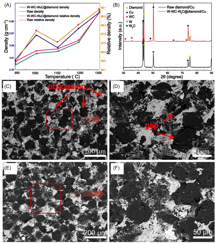 改性后复合材料相对密度达99.08%(1350°C烧结)。断面SEM显示,未改性样品中金刚石大量脱落,而梯度涂层样品界面结合紧密,无可见缝隙。