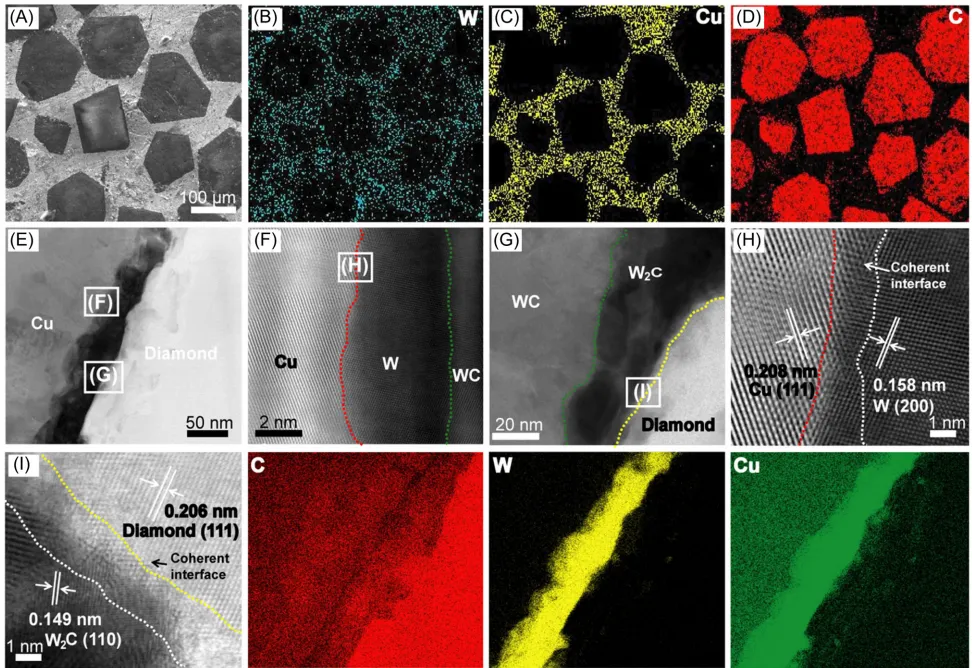 元素分布图(图5)证实W元素主要富集于界面,少量扩散至铜基质。TEM观测到Cu/W与W₂C/金刚石之间存在共格界面,有效促进声子传输。