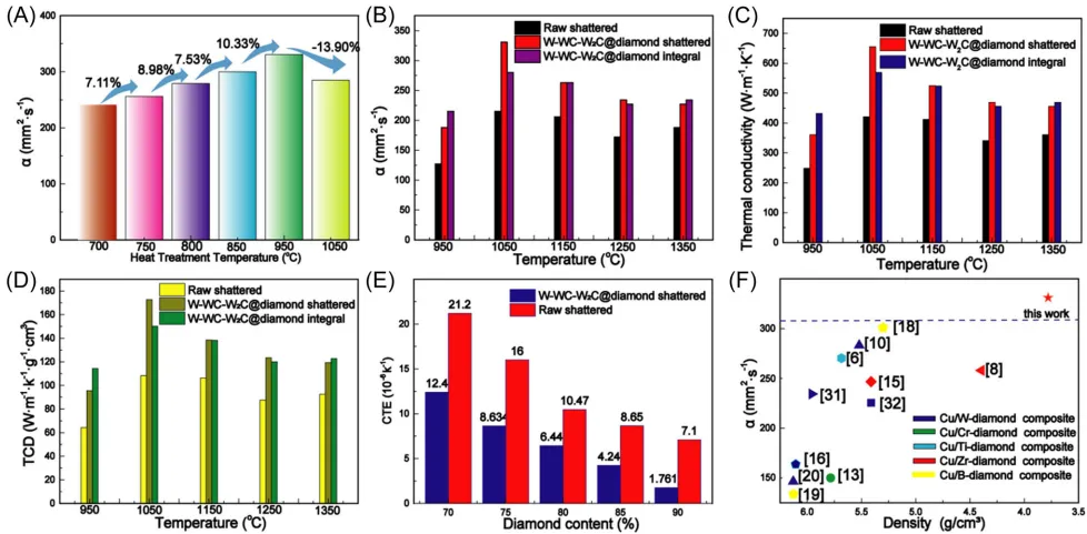 在950°C热处理、1050°C烧结条件下,改性样品热扩散系数达331 mm²·s⁻¹,热导率655 W·m⁻¹·K⁻¹,较未改性样品提升55%。热膨胀系数随金刚石含量增加而降低,90%含量时仅为1.76×10⁻⁶ K⁻¹。