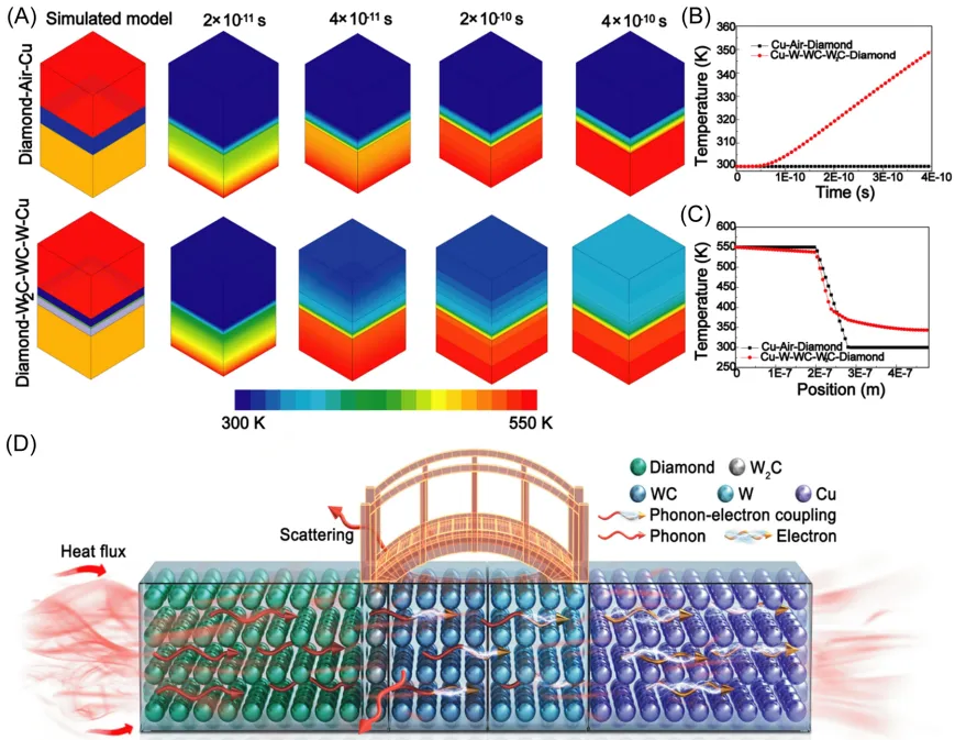创新界面设计:通过W-WC-W₂C梯度层实现金刚石与铜的紧密界面结合,降低热阻。