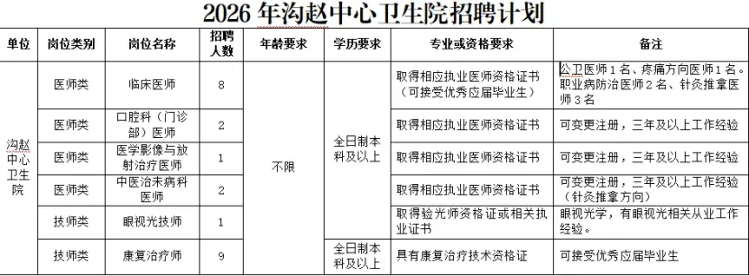 【河南郑州】沟赵中心卫生院招聘23人(临床、口腔、影像、治未病、眼视光、康复)