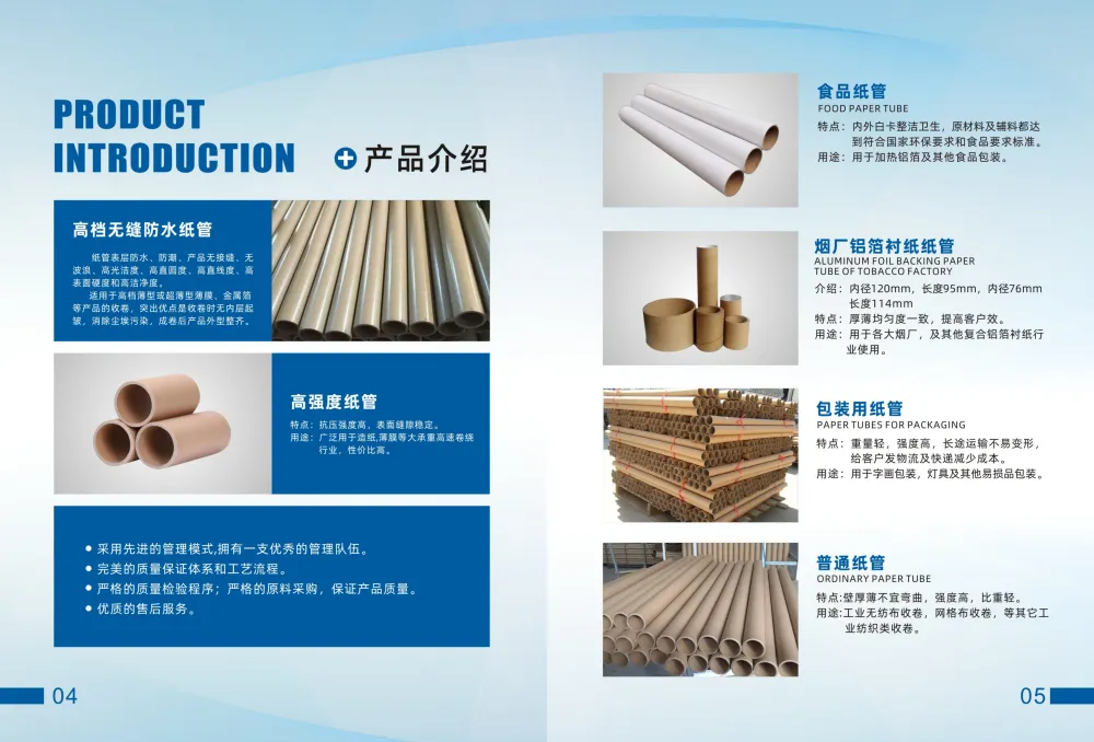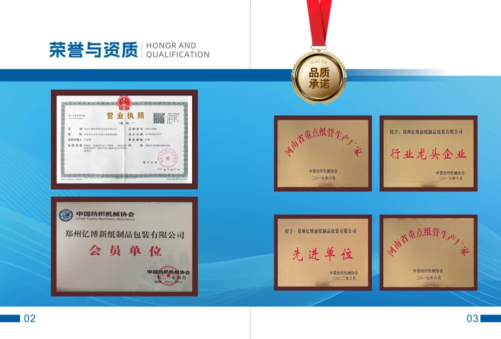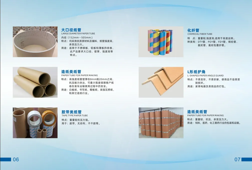 郑州亿博新纸制品包装有限公司坐落在风景秀丽,区位经济基础雄厚的河南省郑州市新密产业聚集区,我公司始建于1989年,生产纸管已有20多年历史,生产经验丰富,资金技术力量雄厚,生产设备先进,是河南省生产纸管重点厂家,公司生产各种规格的高、中档螺旋纸管,工业用纸管,高强纸管,大口径纸管,高档无尘无缝防水纸管,以及各种化纤用的高速纺丝纸管等200多个品种内径(20mm—500mm壁厚2mm—20mm规格),主要运用于高档超薄型膜和铝箔,铜箔等产品的收卷,具有高光洁度,高真圆度,高直线度,高表面硬度和高强度的特点,为下游客户提供最满意的产品。