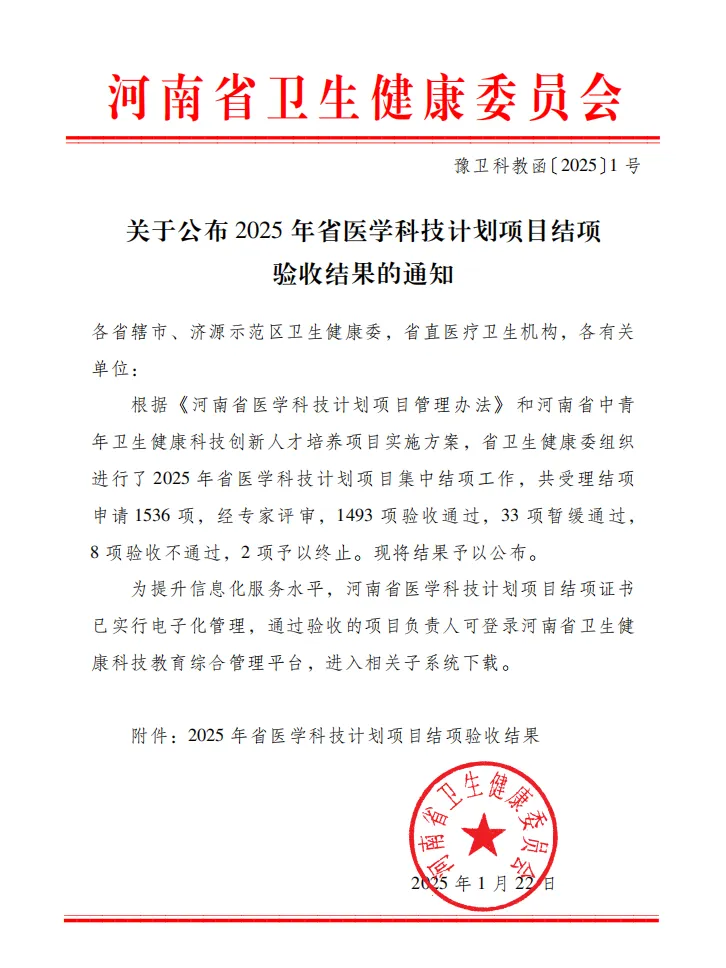 2025年1月22日,河南省卫生健康委员会下发《关于公布2025年省医学科技计划项目结项验收结果的通知》,其中郑州颐和医院组织申报的3项科研课题,全部顺利通过验收。
