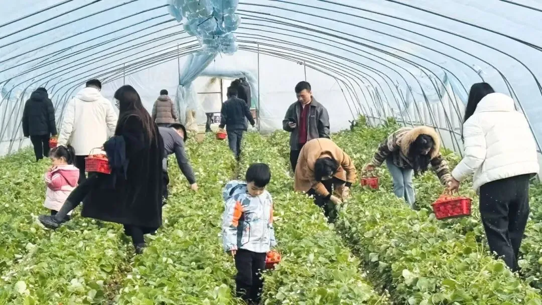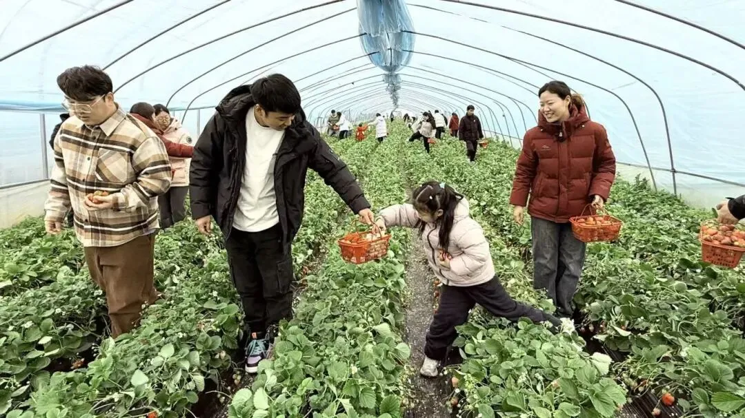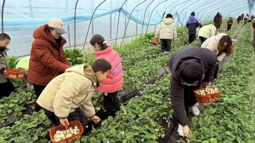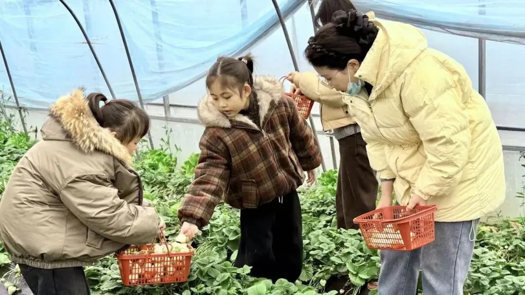 迎着和煦的春风,老师们携娃同行,一路欢声笑语,向着田园奔赴。抵达采摘园,清新的泥土芬芳与浓郁的草莓果香交织萦绕,瞬间将平日工作的疲惫一扫而空。走进温室大棚,翠绿的藤蔓枝叶间,一颗颗红彤彤的草莓饱满诱人、垂挂枝头,轻咬一口,清甜多汁的滋味在舌尖化开,满是春日独有的鲜甜与美好。