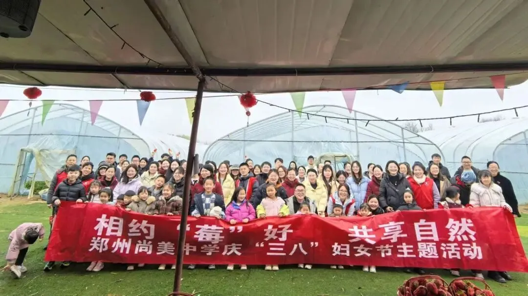 ZHENGZHOU SHANGMEI MIDDLE SCHOOL三月春风送暖,巾帼芳华绽放。在第116个“三八”国际劳动妇女节如约而至之际,为致敬辛勤耕耘在教育一线的女教职工,丰富大家的课余生活、凝聚校园团队力量,2026年3月7日上午,郑州尚美中学以“相约‘莓’好,共享自然”为主题,组织全体教职工赴郊外草莓采摘园开展节日采摘活动,让老师们在自然之境中邂逅甜蜜,共度一段惬意美好的春日时光。