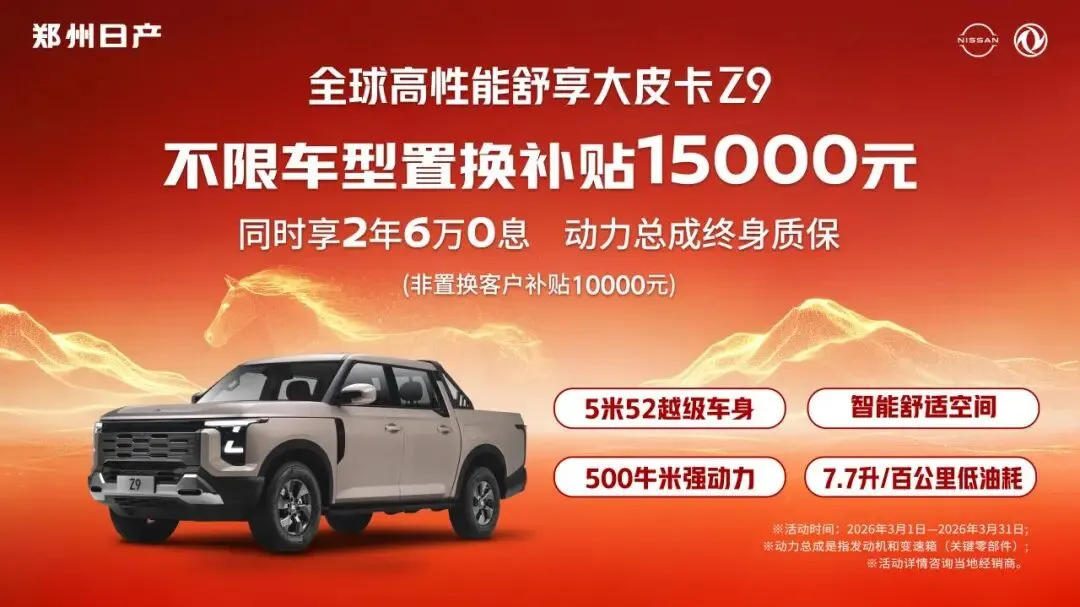 郑州日产Z9 全球高性能舒享大皮卡,5米52越级车身,智能舒适空间,500牛米强动力,7.7升/百公里低油耗