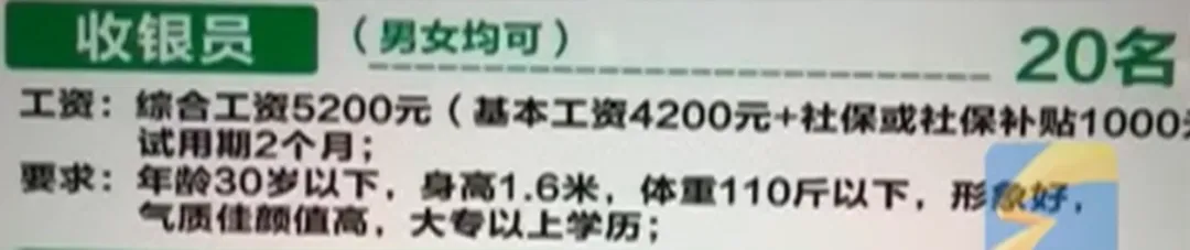 引发争议的核心,是一条与业务能力毫无关系的“硬规定”:招聘收银员,要求体重必须在110斤以内。