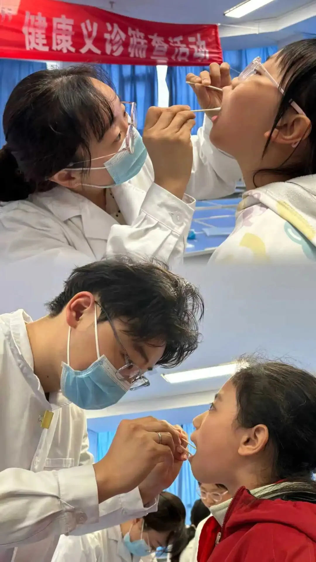 口腔科医生手持棉签,耐心查看学生口腔状况,叮嘱正确刷牙、预防龋齿的方法,引导学生养成良好口腔卫生习惯。