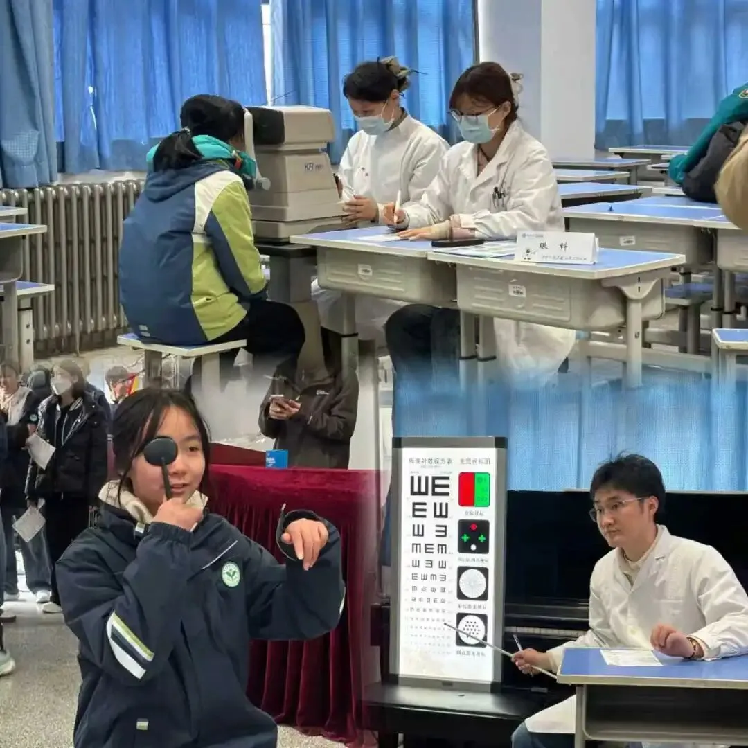 视力检查区,医护人员指着标准对数视力表,为学生检测视力,提醒大家保持正确读写姿势、科学用眼,预防近视加深。