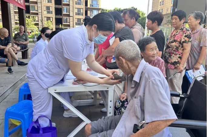 护理人员一边测量血压、血糖,
