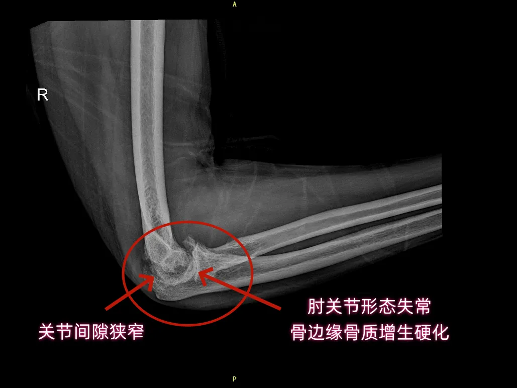 DR片显示:右肘关节诸骨边缘可见骨质增生、关节间隙变窄、关节面毛糙、密度增高——骨质已被长期炎症侵蚀。