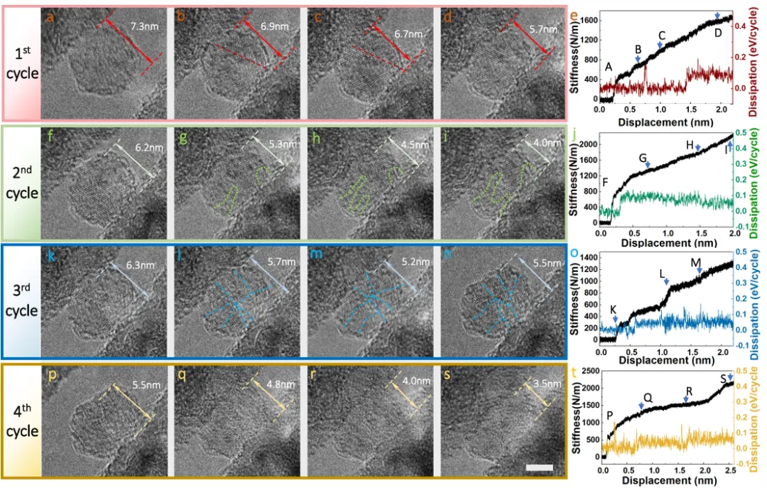 图 2.金刚石纳米粒子的塑性变形过程。该纳米粒子经过四次压缩以研究其变形机制。a-e、f-j、k-o 和 p-t 分别展示了第一次、第二次、第三次和第四次压缩周期的透射电子显微镜图像以及相应的力-位移响应图。g-i 中的虚线突出显示了压缩过程中的无定形区域。l-n 中的虚线标记了由无定形碳网络将纳米粒子分割成小颗粒的位置。A-D、F-I、K-M 和 P-S 在 e、j、o 和 t 中的标注对应于 a-e、f-j、k-o 和 p-t 的透射电子显微镜图像采集时刻。分别地;各自地刻度标尺的长度为 3 纳米。