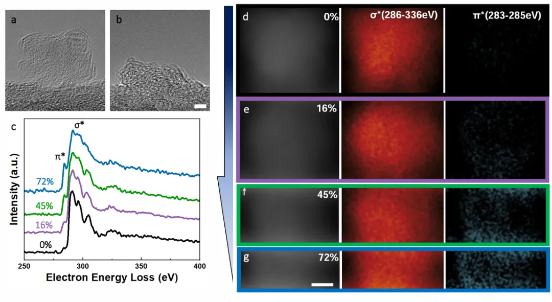 图 4.根据应变情况对 sp²/sp³ 变化的能谱成像。a - b 为纳米粒子在压缩前后的透射电子显微镜图像(相同比例)。比例尺为 2 纳米。c 在不同应变水平下获取的碳 K 能边电子能量损失光谱(EELS),显示 π* 峰强度逐渐增加,表明逐步形成的 sp² 键。展示了在压缩过程中金刚石纳米粒子的 d-g EELS 光谱图像以及 π*/σ* 偶合态映射。286 - 336 eV 范围内的 EELS 信号对应于由 sp³ 偶合产生的 σ* 轨道的跃迁(红色),而 283 - 285 eV 的信号则对应于与 sp² 偶合相关的 π* 轨道的跃迁(绿色)。标尺为 3 纳米。