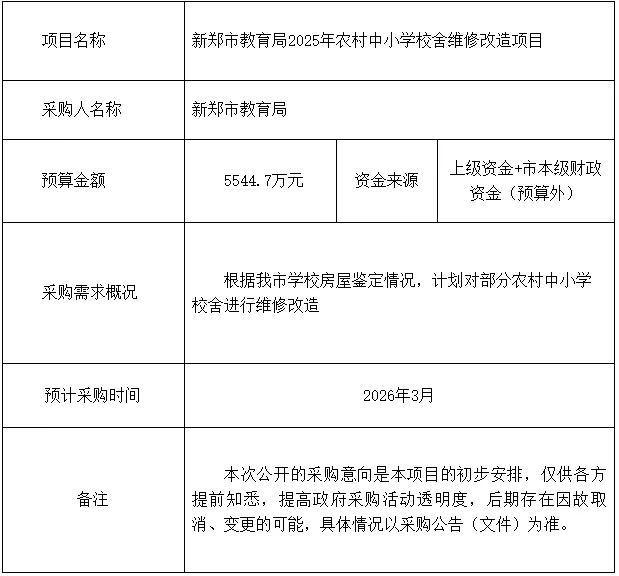 5544万元,新郑教育局即将对农村中小学校舍进行维修改造!新郑市教育局2025年农村中小学