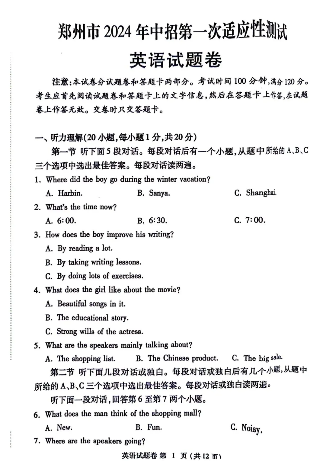 2024年郑州一模英语.pdf