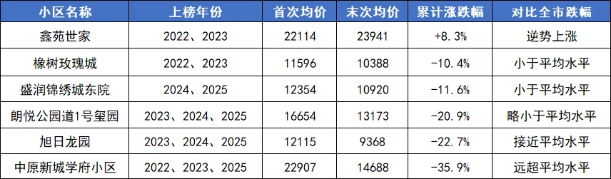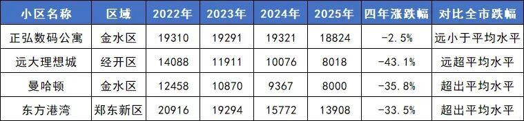 这是一篇关于二手房的数据稿,还原下过去四年的郑州二手房。四年时间,横跨疫情末期、政策松绑、市场探底的全周期,这组数字就像一部浓缩的郑州楼市纪录片。首先看第一组数据,这个是近四年大郑州二手房住宅成交均价:四年时间,全市均价从11423元/㎡跌到8805元/㎡,累计跌幅22.9%。这组数字就像一把标尺,丈量着郑州楼市的冷暖。但把TOP10小区放在这把标尺下对比,你会发现更惊人的真相:有的小区跌幅远超大盘,接近腰斩;有的小区却几乎没跌,甚至逆势上涨。今天,我们就用这份榜单,拆解郑州楼市的真实面目。对于不知道买哪里的朋友,可以直接抄这份作业。想获取近四年郑州二手房成交TOP小区清单及其成交均价的朋友,扫码回复【二手TOP】我发给你,能够给你买二手房一个很好的参考:把四年榜单叠在一起,你会发现只有四个小区年年上榜,堪称郑州楼市的“四大金刚”:正弘数码公寓是唯一的“抗跌王”,四年仅跌了2.5%,远优于全市22.9%的平均跌幅。金水区核心地段+小户型低总价+优质学区,完美切中了刚需最硬核的需求。对于想在主城上车的年轻人,或者是追求低成本学区房的家长,它依然是闭眼可入的选项。远大理想城则是“跌幅冠军”,从1.4万跌到8千,跌幅高达43.1%,几乎是全市跌幅的两倍。经开区大盘、房龄渐老、缺乏顶级学区,只能靠降价换成交量。但换个角度,如果你预算有限,它现在确实够便宜,价格已经回到2016年前后。曼哈顿从1.2万跌到8千,跌幅35.8%。曾经的金水区“小曼哈顿”,如今商住混杂、环境嘈杂的弊端被市场用脚投票。但8千买金水区商圈,更多的是追求租售比的客群。该小区楼下就是地铁1号线燕庄站,到CBD上班两站地。东方港湾从2万跌到1.4万,跌幅33.5%。郑东新区的光环褪去,但价格回归后,对于想在东区置业的自住客,反而成了机会。除了四年全勤的,还有不少小区上榜两三次,它们的涨跌幅同样值得研究:朗悦公园道1号玺园、旭日龙园这两个小区已经连续三年都在榜单里,说明流动性强、关注度高。如果你在上述四大金刚里没找到心仪的,可以看看它们:朗悦公园道1号玺园:高新区核心,有商业有学校,跌幅控制在20%左右,略好于全市平均。旭日龙园:郑东新区的“价格屠夫”,9000多的均价就能上车东区,跌幅与全市持平,楼下就是地铁3号线东周站,交通便利;重点是划片康平小学+96中。如果只看绝对值,远大理想城以43.1%的跌幅夺冠。但若考虑高价盘的跌幅,中原新城学府小区从2.29万跌到1.47万,跌掉8200元/㎡,同样惨烈。有意思的是,鑫苑世家是唯一逆势上涨的小区,2022→2023年涨了8.3%。但2024年后它就消失了,说明高价学区房有价无市,业主惜售,买家不跟。这个“作业”不好抄,价格虽高,但流动性没了。郑州绿都城7416元/㎡,曼哈顿8000元/㎡,远大理想城8018元/㎡……这些价格甚至低于全市均价8805元/㎡。这说明二手房市场已经进入深度的“以价换量”阶段,只有足够便宜,才能打动买家。正弘数码公寓18824元/㎡,中原新城学府小区14688元/㎡,东方港湾13908元/㎡,这些楼盘要么地段绝佳,要么学区过硬,要么品质在线,价格明显高于全市大盘。同样是金水区小户型,正弘数码公寓2025年还能卖18824元/㎡,而曼哈顿只有8000元/㎡;同样是中原区,中原新城学府小区14688元/㎡,而郑州绿都城7416元/㎡。买房再也不能只看区域,必须精挑细选具体楼盘。四年TOP10,就是郑州二手房的一部“价格简史”。它告诉我们:地段、学区、品质是三大护城河,但护城河也会干涸,如果价格太高的话。最后,我想用榜单里最坚挺的正弘数码公寓做个结尾:它之所以四年不倒,不是因为产品多牛,而是因为它切中了最根本的需求,一个位置好、学区优、总价低、能上车的地方。无论市场如何变幻,这样的需求永远都在。至于那些跌跌不休的楼盘,或许只是在还过去几年“透支”的债。最后,刚刚出炉的这份《2025郑州房地产市场复盘·内部参考版》,里面把去年政策底牌、新房成交真相、二手房捡漏空间、租金涨跌趋势,扒得干干净净。它不是网上的碎片化新闻,而是一份长达39页的完整复盘。有了它,你再去看房,中介不敢给你胡诌,因为数据在手,你就是半个专家。扫码加微信,回复【内参】,免费领取这份“避坑指南”。