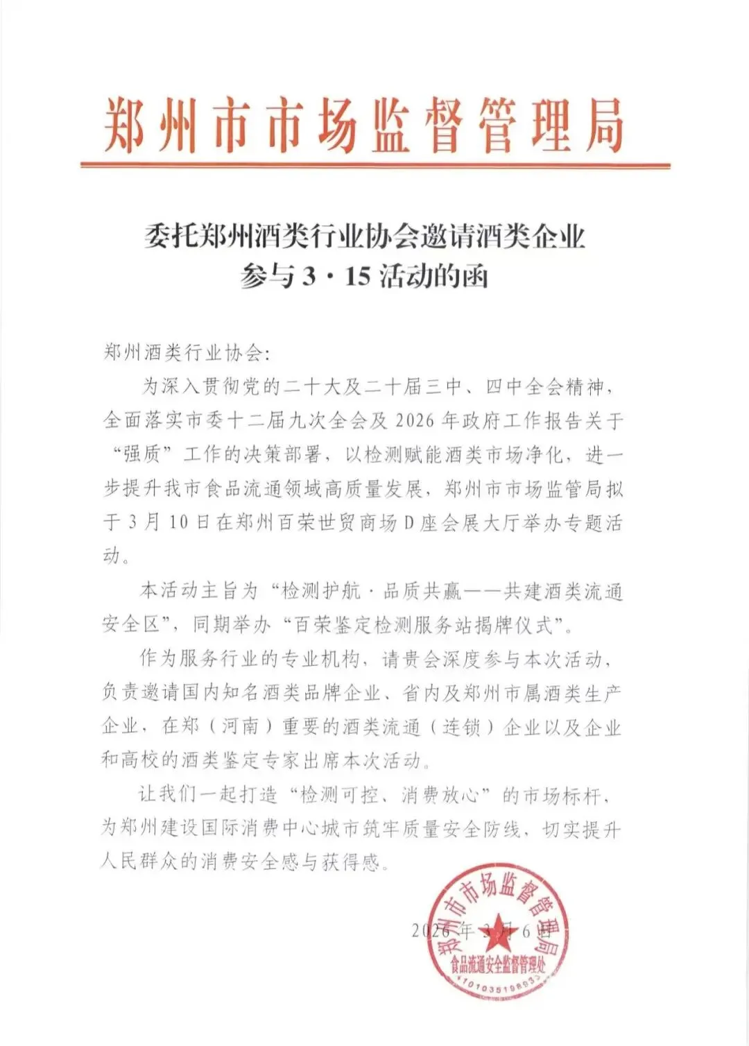 郑州酒协受郑州市市场监督管理局委托邀请酒类企业参加3●15活动的函