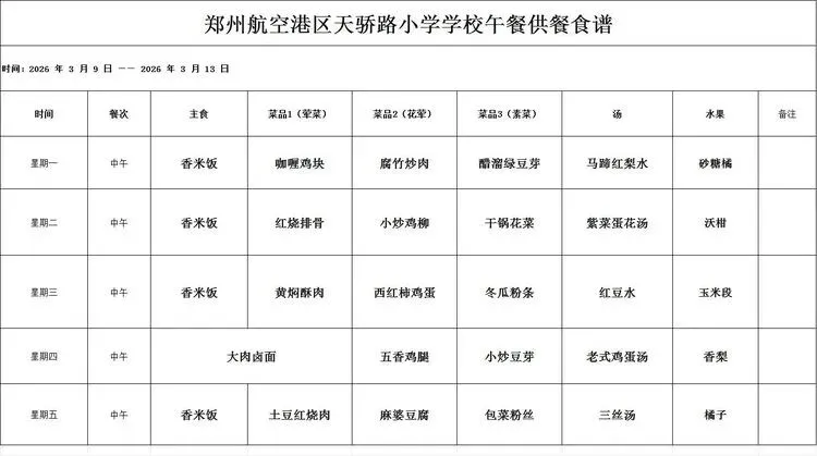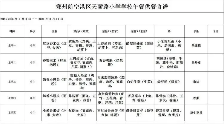郑州市郑东新区九年制实验学校一周食谱【2026.03.09-03.13】