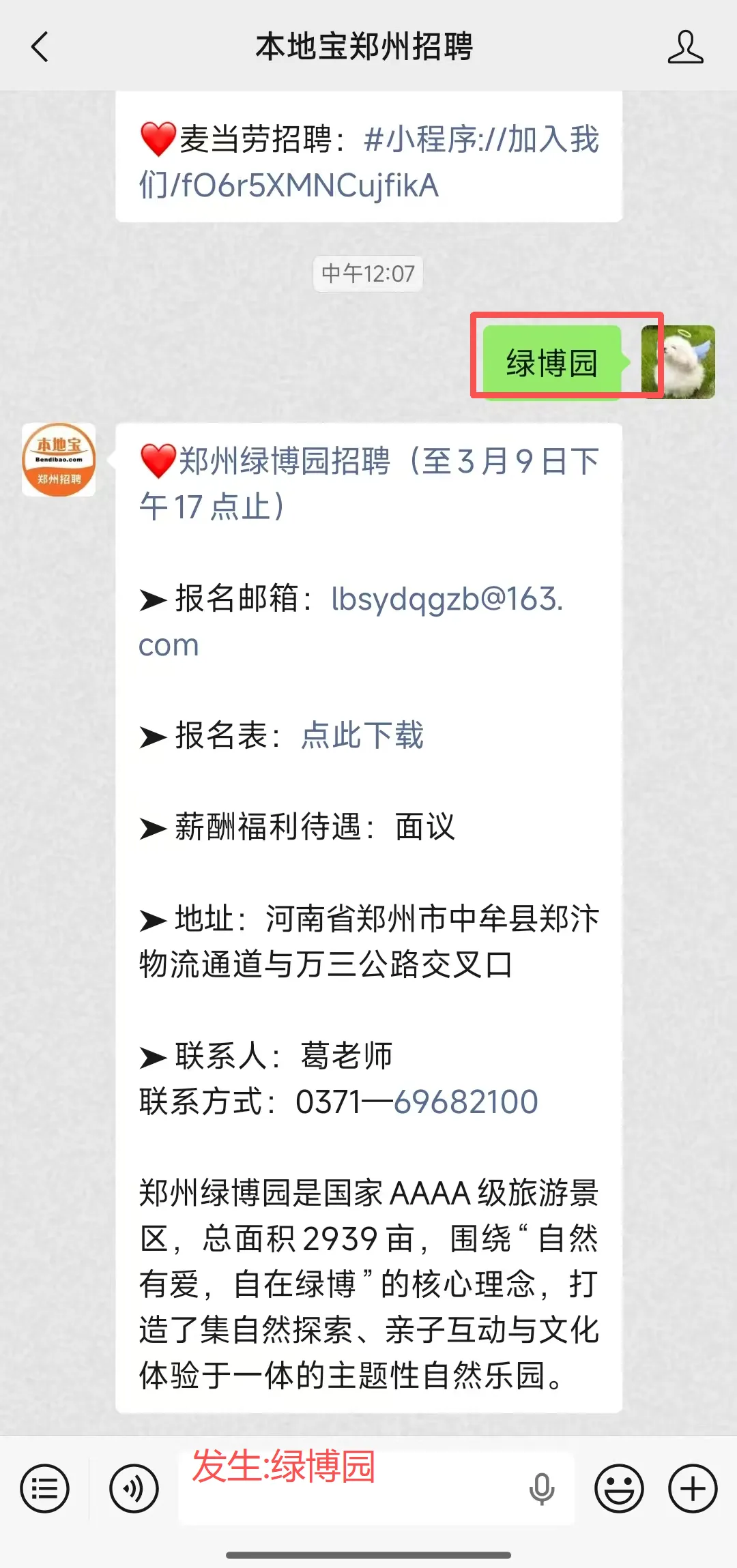 温馨提醒:扫描下方二维码关注【本地宝郑州招聘】微信公众号并在对话框发送【绿博园】即可获取报名表、详细招聘公告等信息