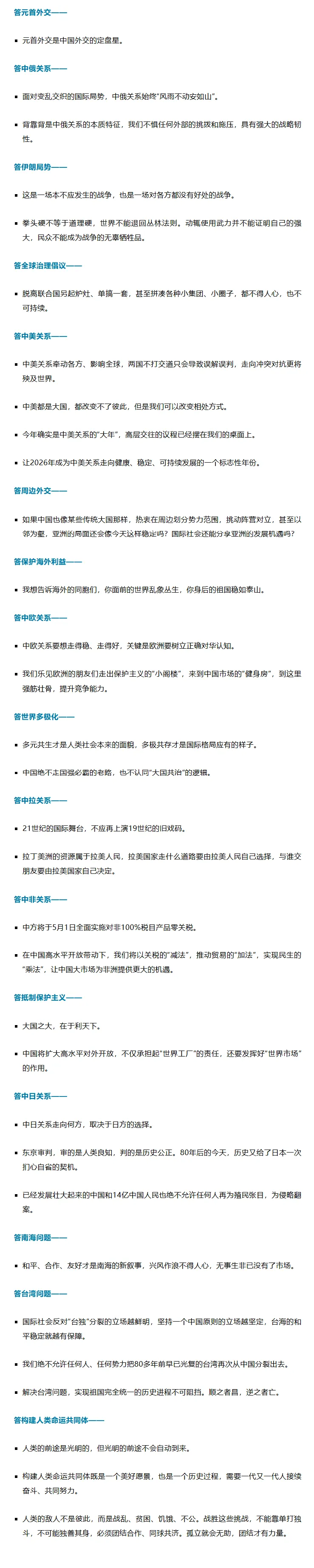 3月8日上午,十四届全国人大四次会议举行外交主题记者会。中共中央政治局委员、外交部长王毅回答中外记者提问。会上,王毅就元首外交、中美关系、台湾问题、伊朗局势、中日关系等21个问题回答了记者提问。王毅外长金句频出、掷地有声,一起来看↓