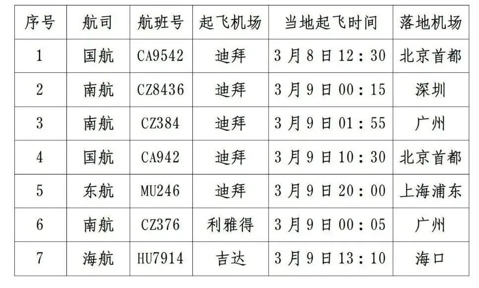 连日来,外交部和中国民航局全力协调,紧急派出航班协助滞留中东地区中国旅客回国。据了解,以下航班尚有余票。外交部领事保护中心建议,滞留中东地区的中国旅客抓紧时间通过以下航班回国,可登录各航空公司微信服务号或小程序购票。