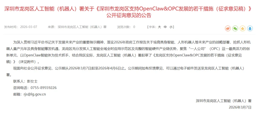 “拥有‘龙虾’等于一人拥有千军万马”,深圳龙岗拟推十条新政,助力OpenClaw开发者与AI单人创业,个人公司项目最高获1000万元助力。