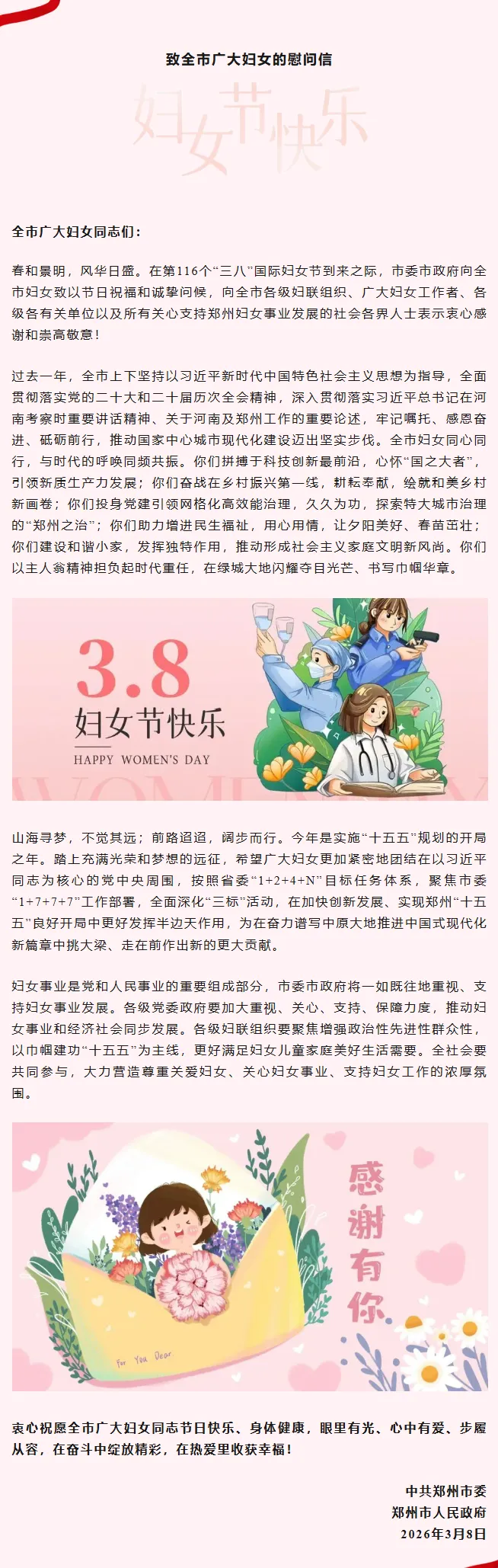 3月8日,第116个“三八”国际妇女节来临,郑州市委、市政府向全市妇女致慰问信送祝福,肯定她们在城市发展各领域的巾帼力量,寄语她们在郑州“十五五”建设中再建新功,同时将持续支持妇女事业发展。