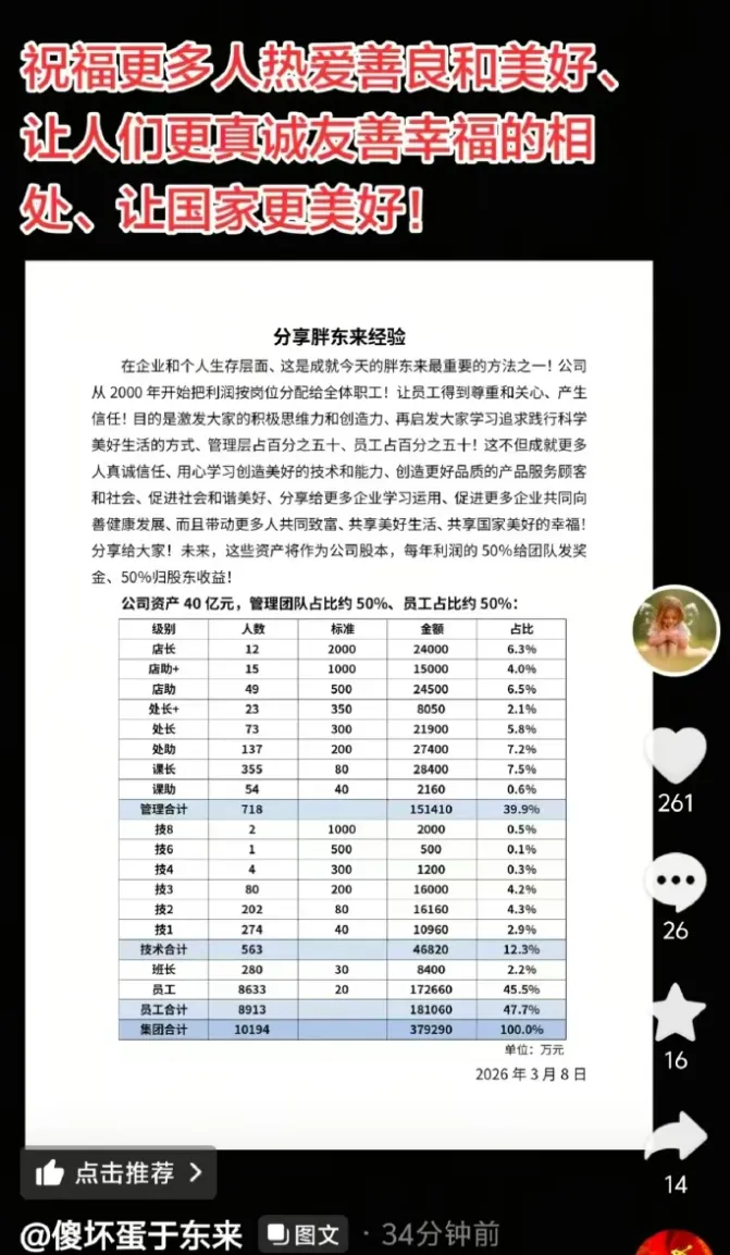于东来发文分享胖东来经验:公司每年利润50%分配给员工3月8日,胖东来创始人于东来在社交平台发文分享胖东来经验,文中介绍:公司从2000年开始把利润按岗位分配给全体职工,管理层占百分之五十、员工占百分之五十!未来,这些资产将作为公司股本,每年利润的50%给团队发奖金、50%归股东收益!公司资产40亿元,管理团队占比约50%、员工占比约50%。