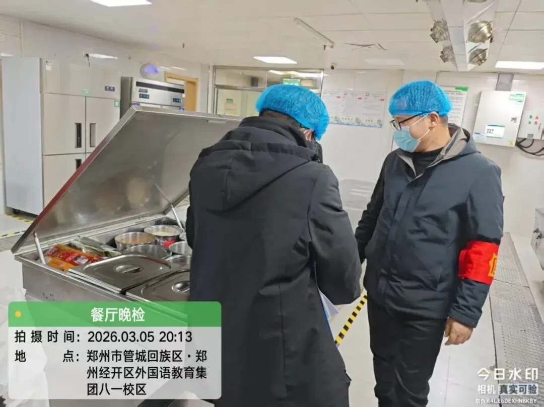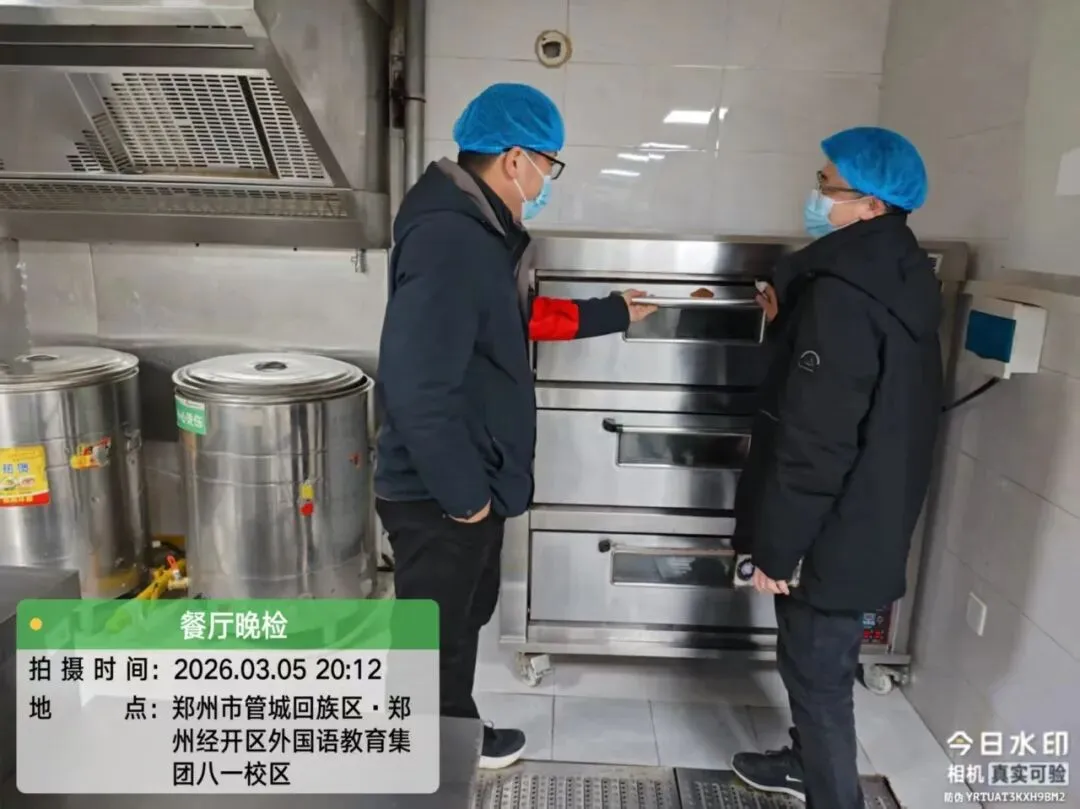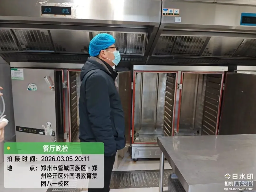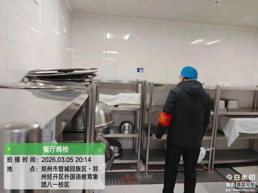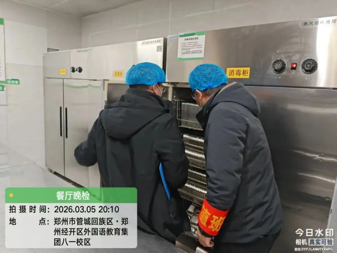 每天晚上9:00校级领导带领总务处人员和食堂从业人员对食堂卫生环境进行检查,三餐前对每样食品留样,为师生就餐保驾护航。
