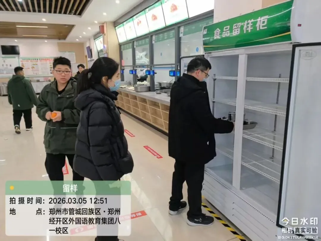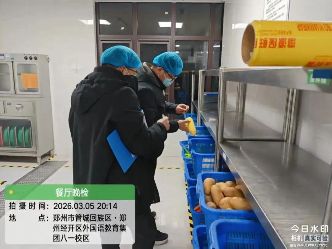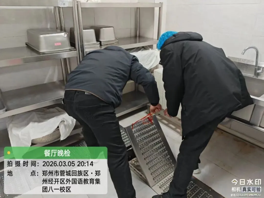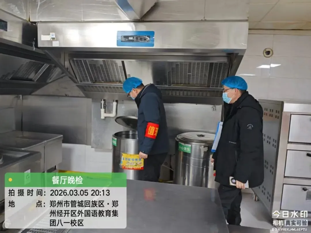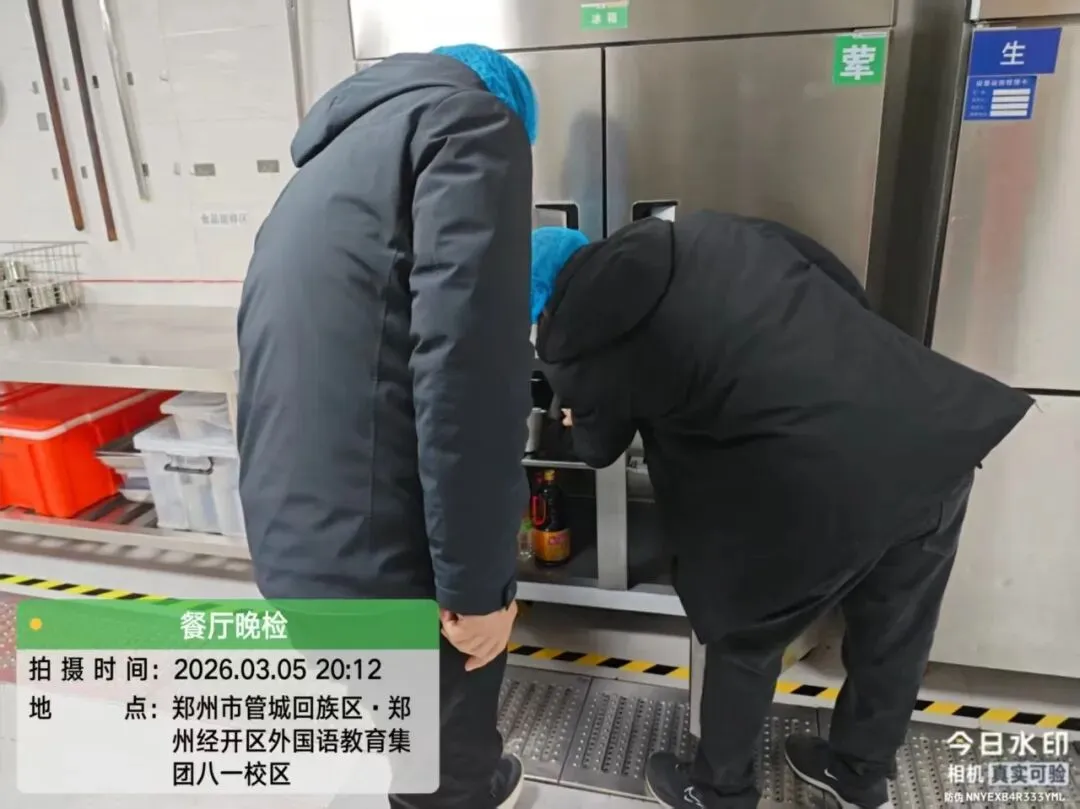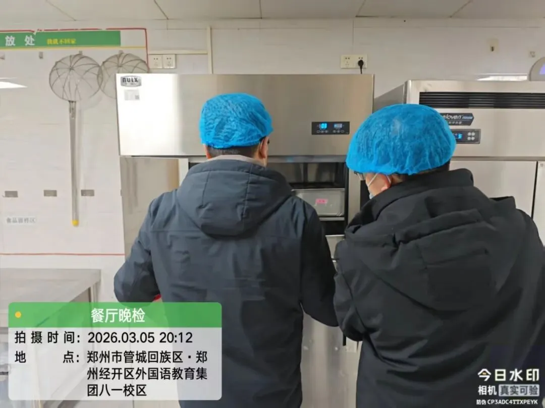 每天晚上9:00校级领导带领总务处人员和食堂从业人员对食堂卫生环境进行检查,三餐前对每样食品留样,为师生就餐保驾护航。