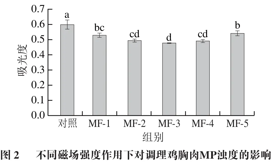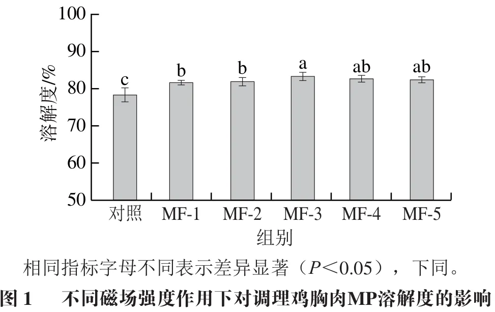 如图1所示,随着磁场强度的提高,MP的溶解度呈现先升高后降低的趋势,与对照组相比,MF-3和MF-4处理组的溶解度显著提高(P<0.05),这一结果直接说明了在调理鸡胸肉冻结过程中磁场辅助对其蛋白质结构的保护效应。