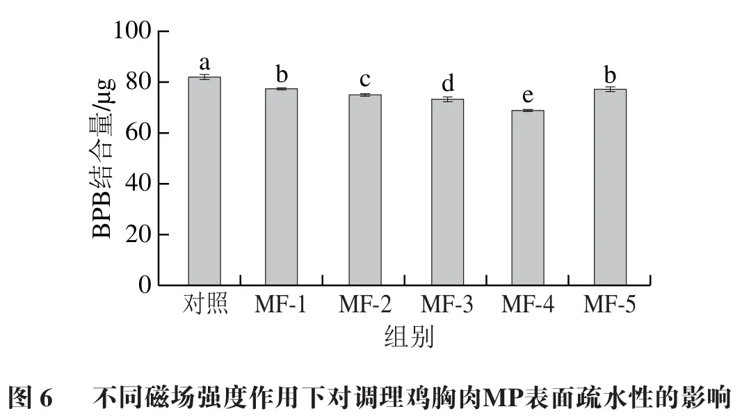 蛋白质的表面疏水性是指蛋白质分子表面与水分子相互作用的亲和能力,在天然蛋白质分子构象中,蛋白质通过表面的亲水氨基酸残基定向排布形成水合层(如羟基、巯基、氨基等),而疏水基团藏于蛋白质内部维持结构稳定。表面疏水性由蛋白质表面疏水性基团所占比例决定。当蛋白质发生变性或结构展开时,内部疏水基团(如脂肪烃链等)暴露,蛋白质分子的表面疏水性显著增强。通过测定BPB染料与蛋白质疏水区域的结合量,可直接反映MP表面疏水基团的暴露程度。如图6所示,对照组调理鸡胸肉MP的BPB结合量显著高于各MF组(P<0.05),表明对照组MP表面疏水基团更多,不可控生长的冰晶加剧了蛋白质结构的破坏程度,内部疏水性基团过度暴露,进而形成难以复溶的大分子聚集体。相较于对照组,各MF组MP表面疏水性的下降趋势明显,BPB结合量均显著低于对照组,其中,MF-4组的BPB结合量最低,为68.54 μg,随着磁场强度的进一步增强,表面疏水性显著回升(P<0.05)。表明适当强度磁场作用下,MP内部的疏水基团仍包裹于分子内部,过低强度磁场对不规则冰晶形成的抑制能力不足,而过强磁场(MF-5)容易干扰冻结过程的热运动,引发局部过冷异常及冰晶重结晶。结合MP溶解度、浊度、粒径结果可知,适度磁场强度可抑制不规则冰晶形成,进一步验证了磁场对于冻结过程的调控作用。