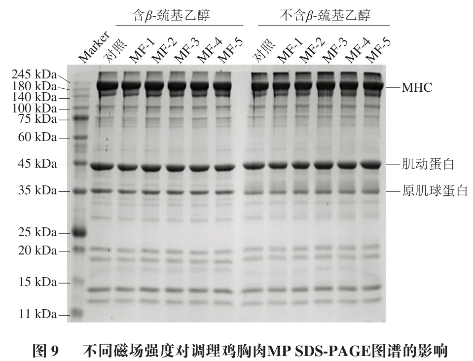 8 磁场辅助冻结对调理鸡胸肉MP凝胶电泳的影响