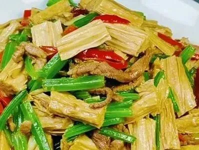 三鲜烩酥肉、酱爆鸡丁、西芹烧腐竹、紫菜蛋花汤、红豆米饭、香蕉。