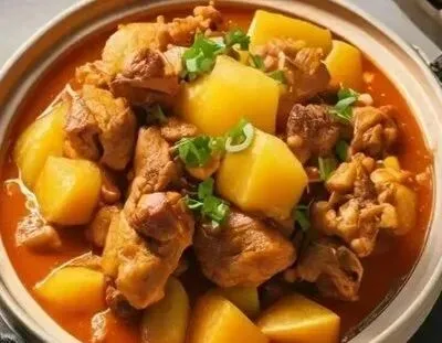 红烧鸡腿、红烧茄子、肉丝蒸卤面、西湖牛肉羹、沃柑。