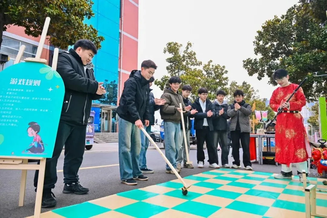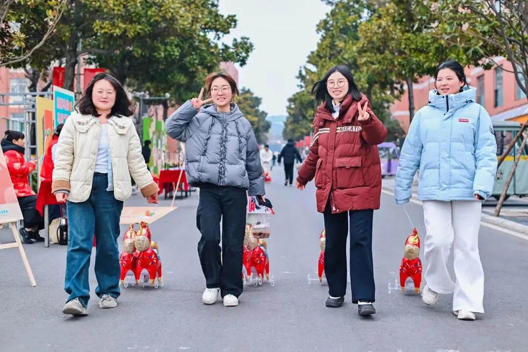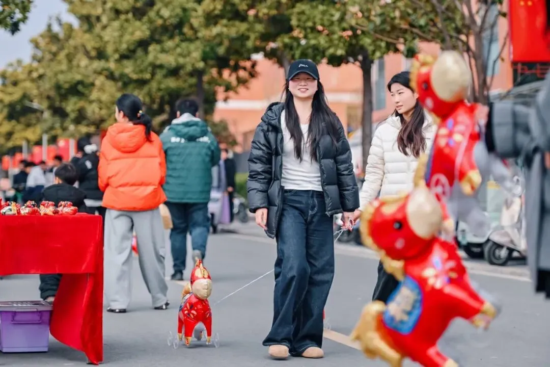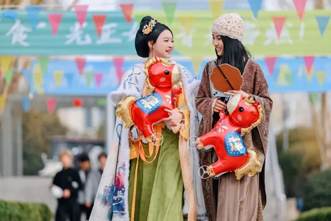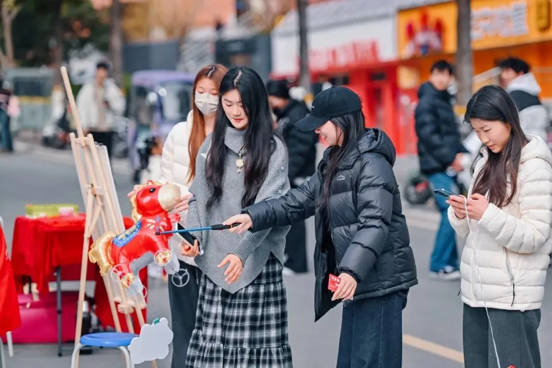 全天开放的趣味闯关区,将古老的非遗技艺与充满活力的现代游戏巧妙融合;商业街的“千军万马”气球矩阵,千只气球组成骏马奔腾之势,穿汉服的学子穿行其间,衣袂翻飞处带起阵阵流光,打造出一场别开生面的文化体验盛宴。