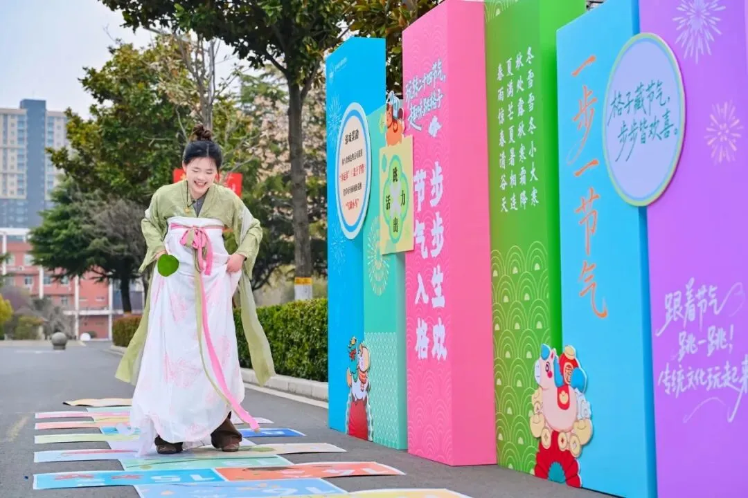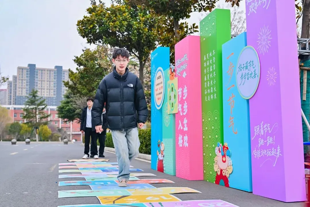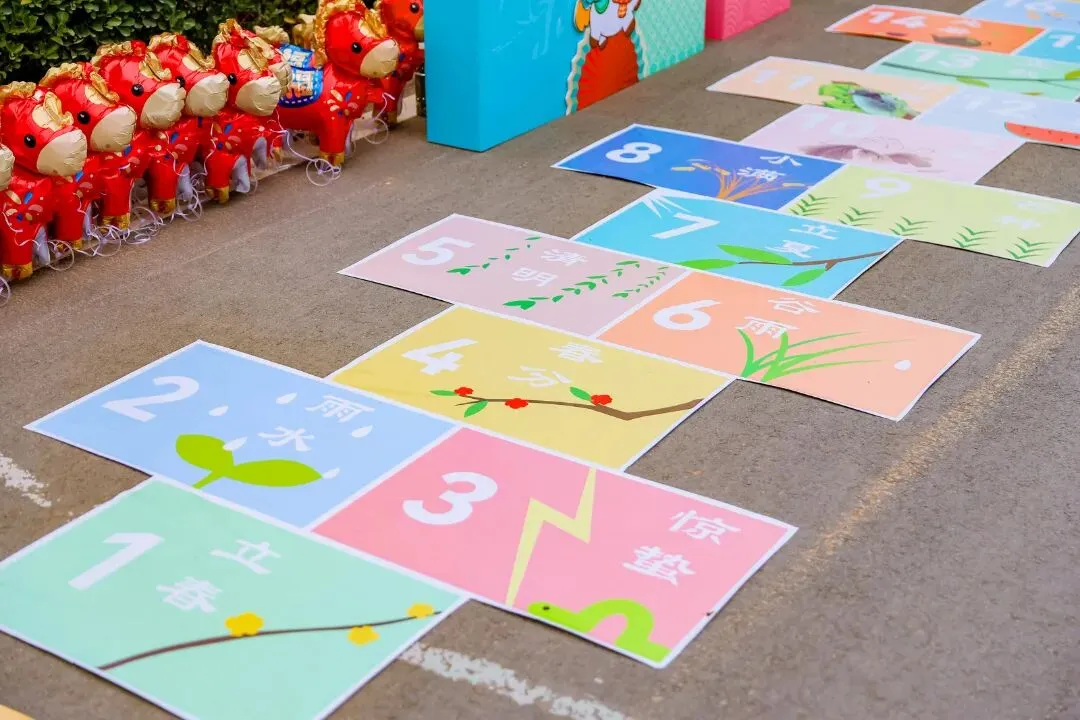 踏入闯关区,首先映入眼帘的是二十四节气跳房子。地面绘制二十四节气的图案,从立春的萌动到冬至的静谧,每一个节气都承载着古人的智慧与对自然的敬畏。学子们轻盈地跳跃在格子间,仿佛感受到四季的更迭。