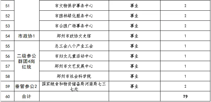 2025年郑州市59个事业单位计划接收79人,2024年这一数据是74人,无论接收人员规模还是接收单位两年整体变化不大。