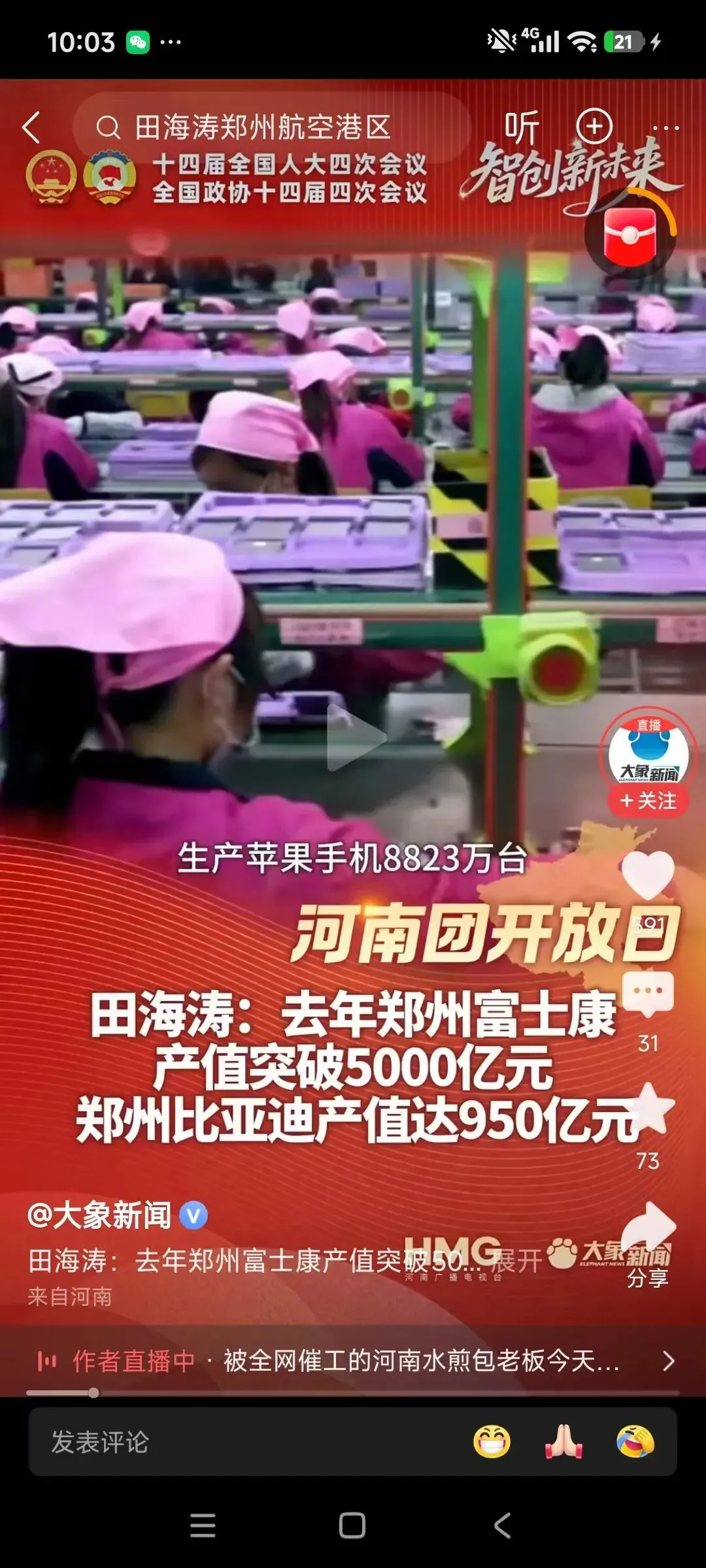 3月7日,在北京开大会的空港区主要领导在答记者问时说,2025年,郑州富士康产值突破5000亿元。