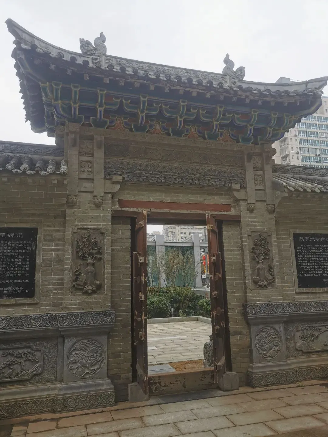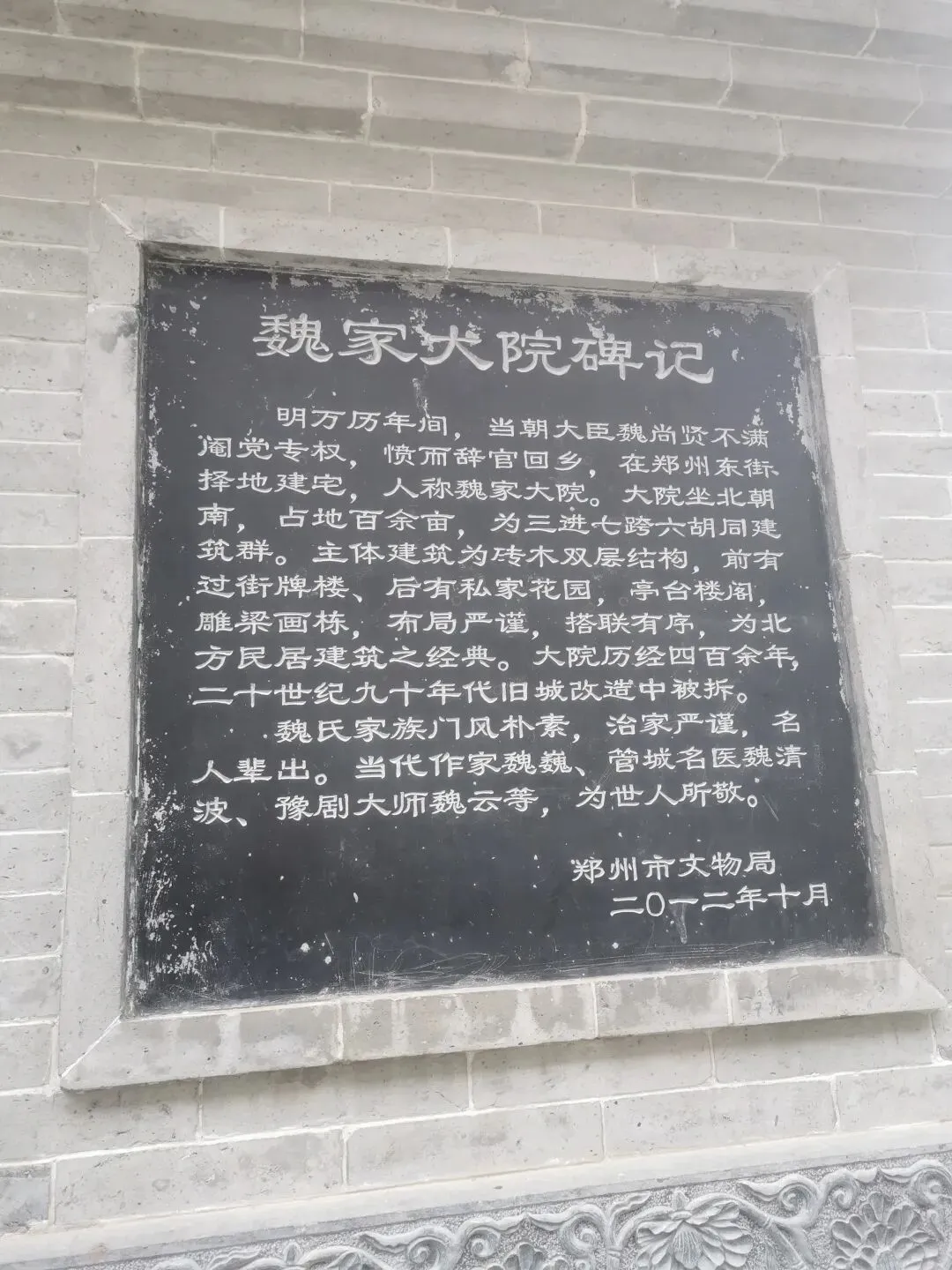 明万历年间,当朝大臣魏尚贤不满阉党专权,愤而辞官回乡,在郑州东街择地建宅,人称魏家大院。大院坐北朝南,占地百余亩,为三进七跨六胡同建筑群。主体建筑为砖木双层结构,前有过街牌楼、后有私家花园,亭台楼阁,雕梁画栋,布局严谨,搭联有序,为北方民居建筑之经典。大院历经四百余年,二十世纪九十年代旧城改造中被拆。
