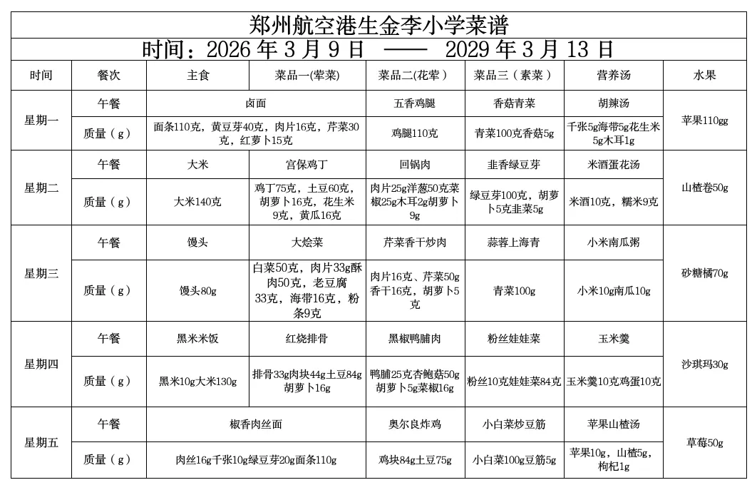 >【每周食谱】郑州航空港区生金李小学午餐食谱丨第二周(3月9日-3月13日)