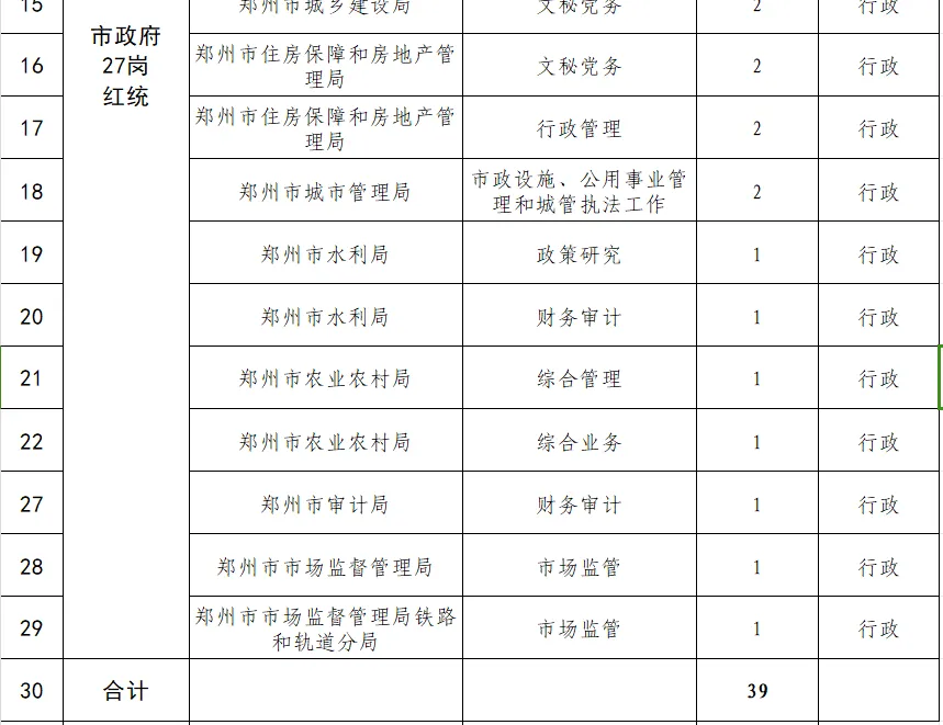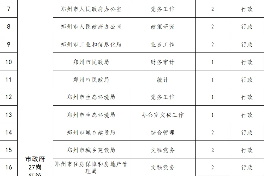 2025年郑州市接收转业军官第一批次提供直通车岗位39个,其中市委6家单位提供12个岗位,市政府13家单位提供27个岗位,全部为行政编。具体单位有: