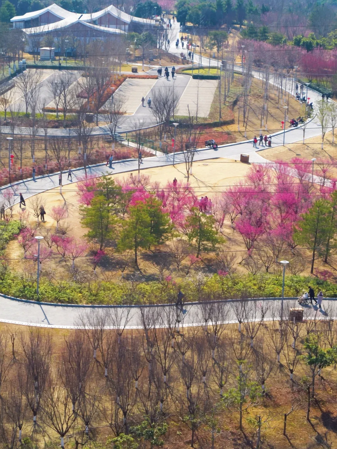 园区的休闲步道蜿蜒穿行在花林间,路面平缓,不管是散步、骑行,还是铺个野餐垫享受春日时光,都超舒服