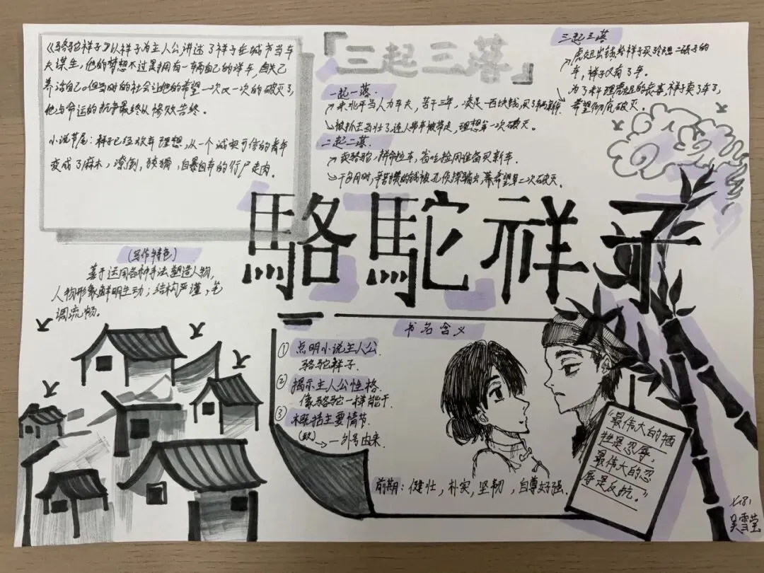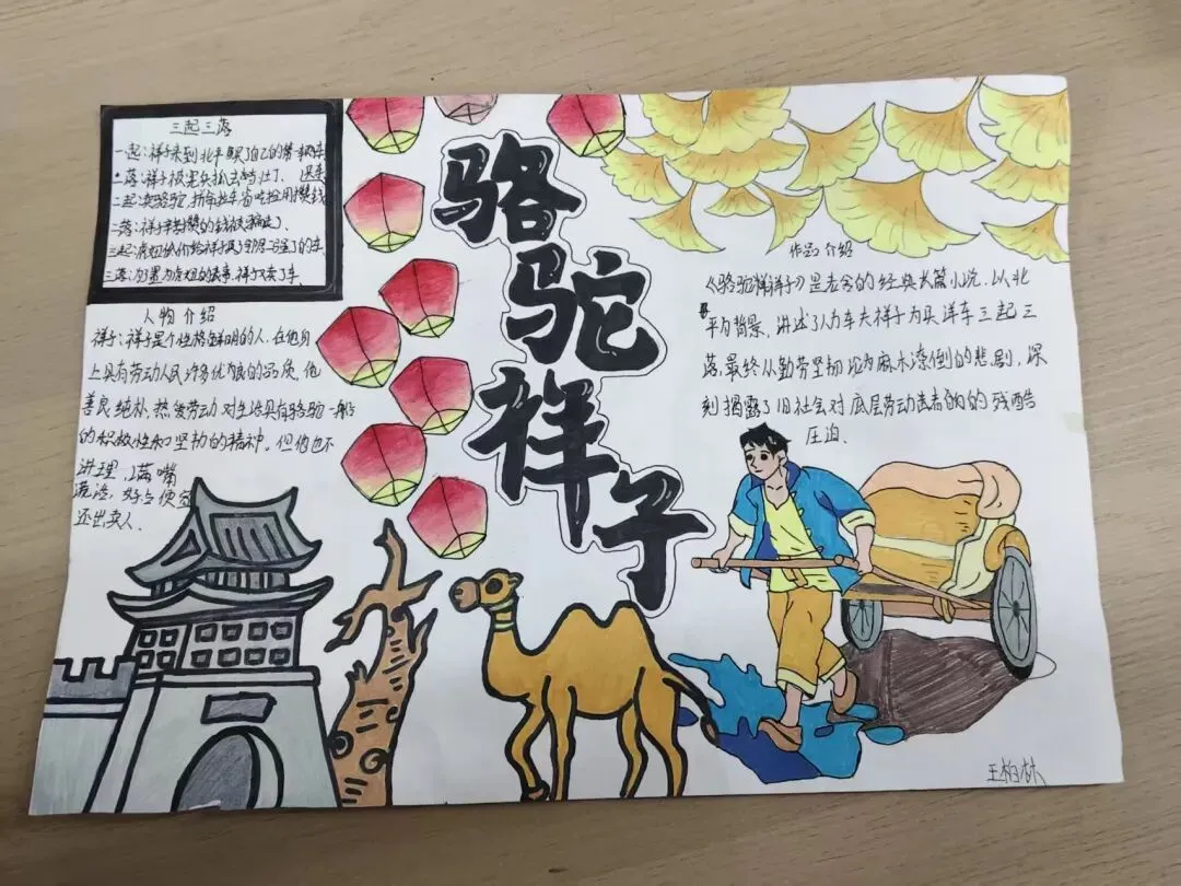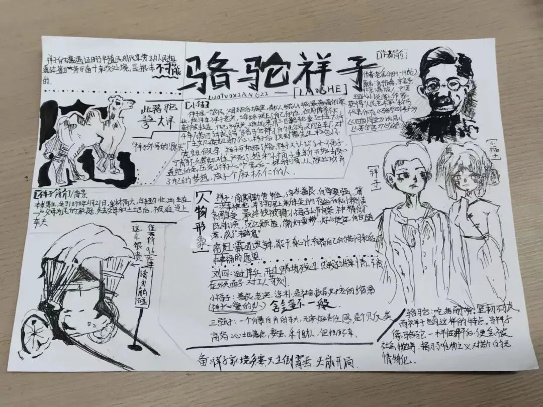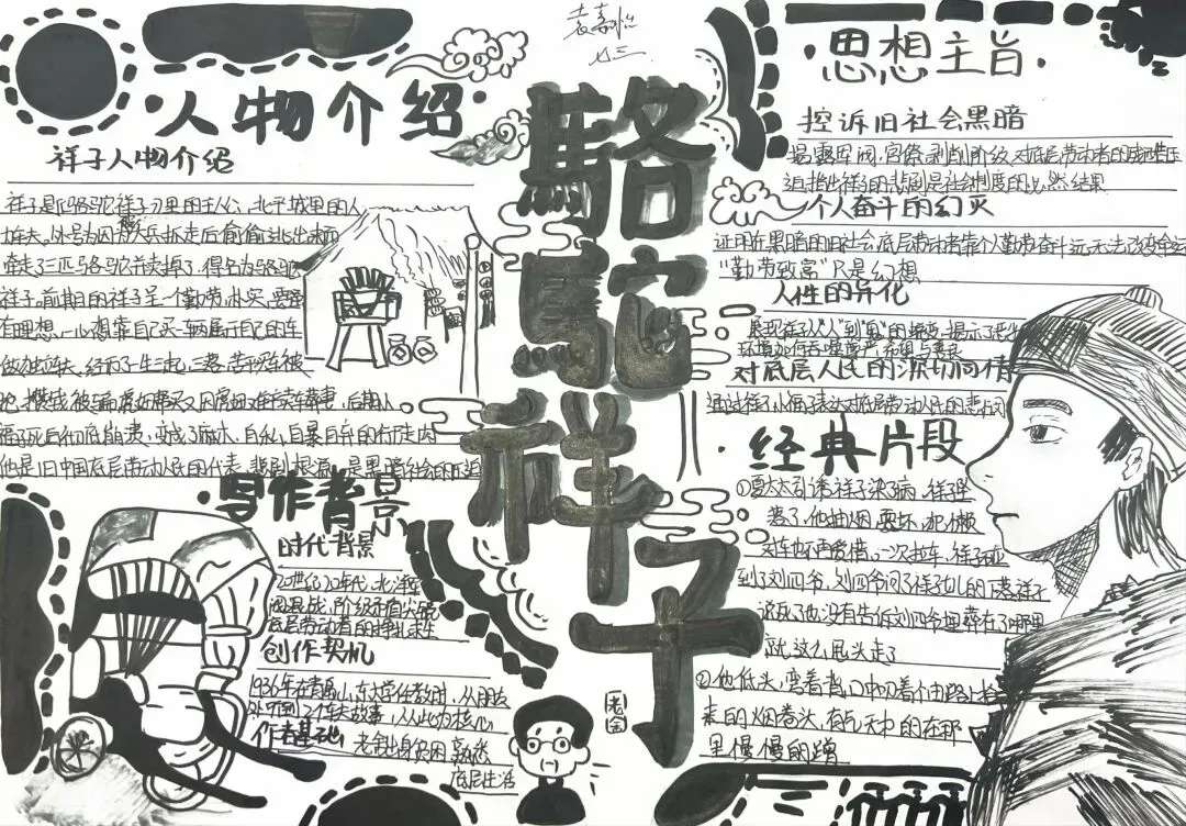 七年级学子以笔为媒,对话经典。在《骆驼祥子》的人力车辙里,勾勒“三起三落”的命运悲歌,剖析旧时代底层劳动者的挣扎与沉沦。一笔一画皆是用心,一字一句皆为感悟。手抄报与思维导图间,青春的思考与文学的力量交相辉映。