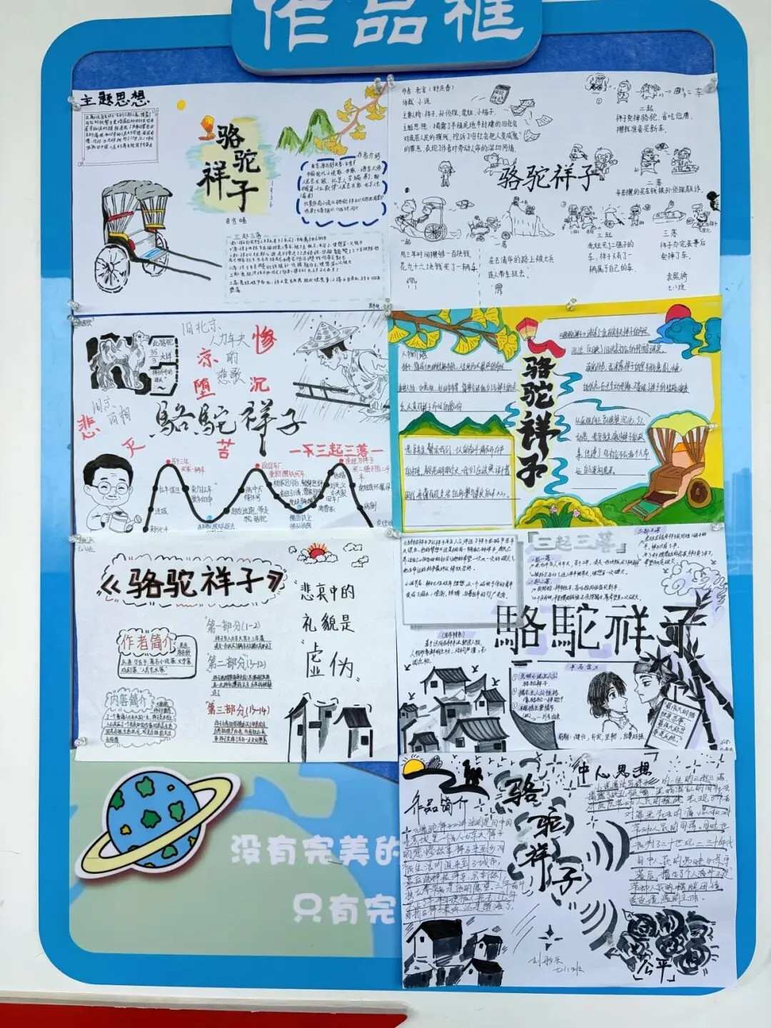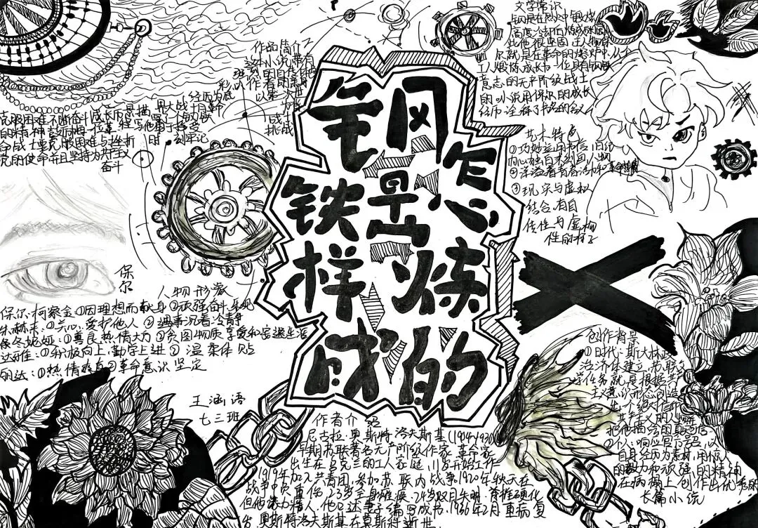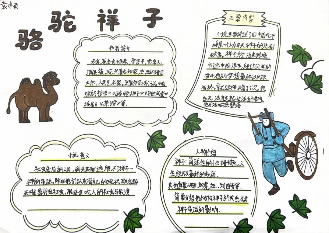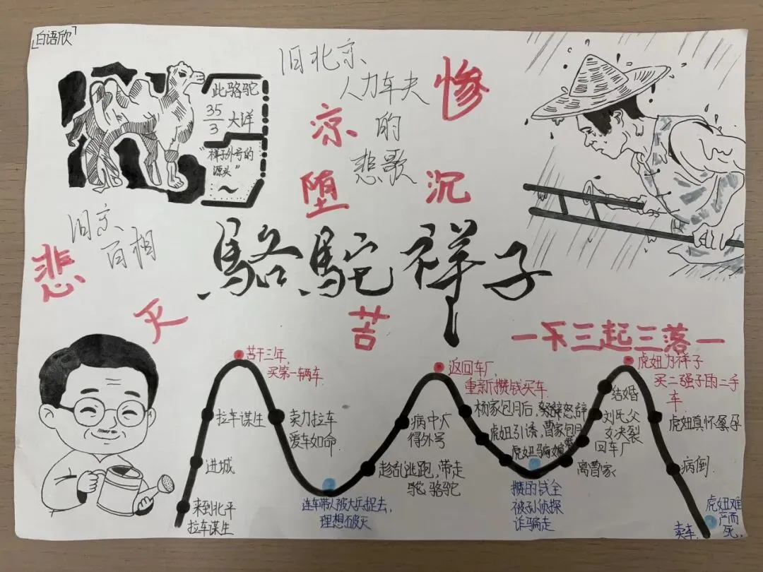七年级学子以笔为媒,对话经典。在《骆驼祥子》的人力车辙里,勾勒“三起三落”的命运悲歌,剖析旧时代底层劳动者的挣扎与沉沦。一笔一画皆是用心,一字一句皆为感悟。手抄报与思维导图间,青春的思考与文学的力量交相辉映。