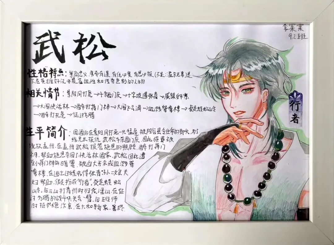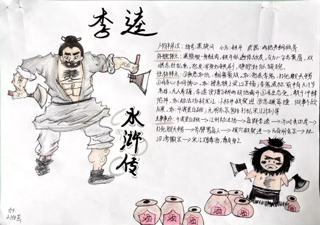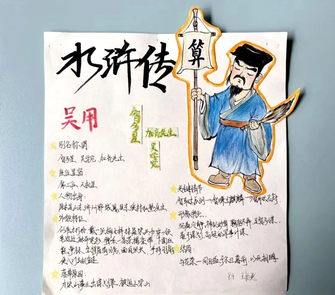 九年级语文组以《水浒传》为蓝本,开展“水浒英雄谱”创意作业实践。学生们执笔为锋,撷取经典人物,融梳理归纳于方寸卡片,汇绘声绘色于笔端插画。