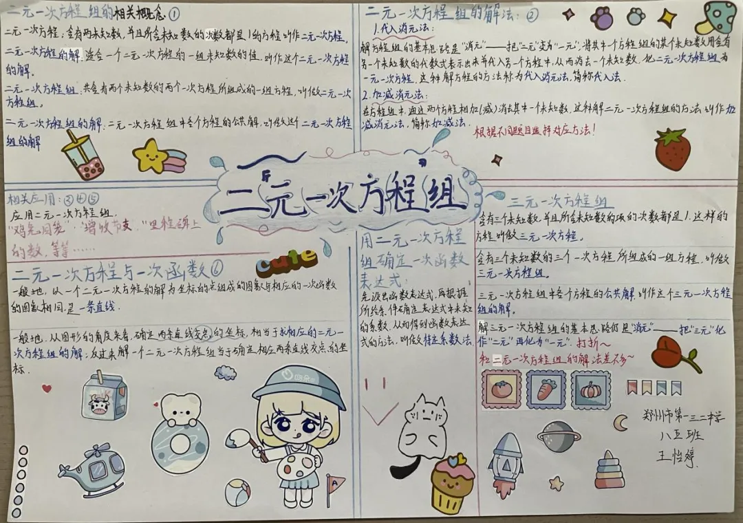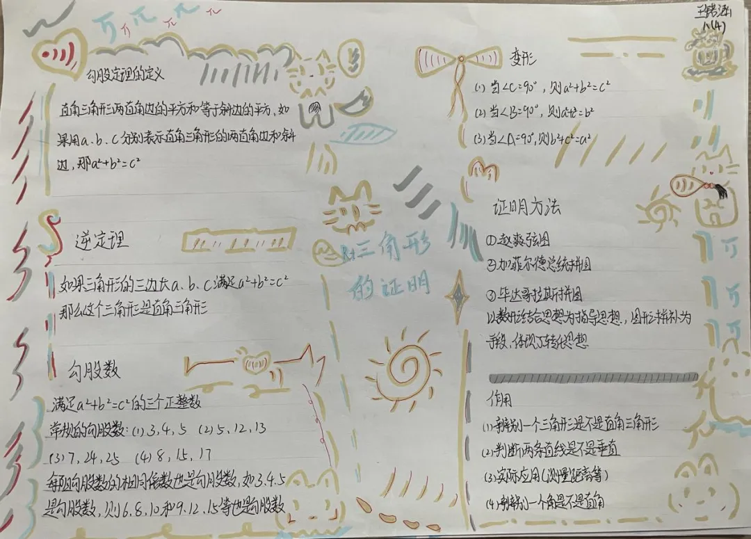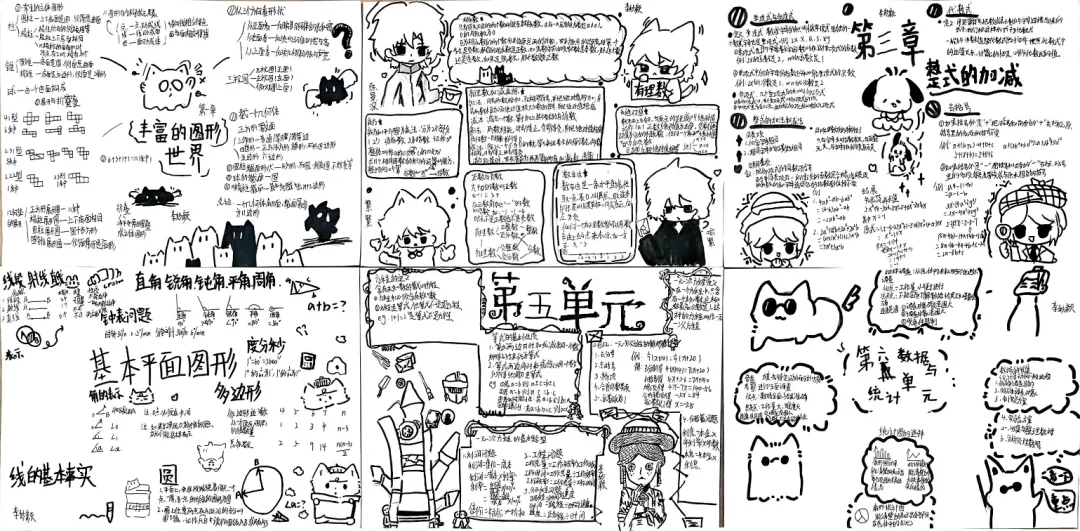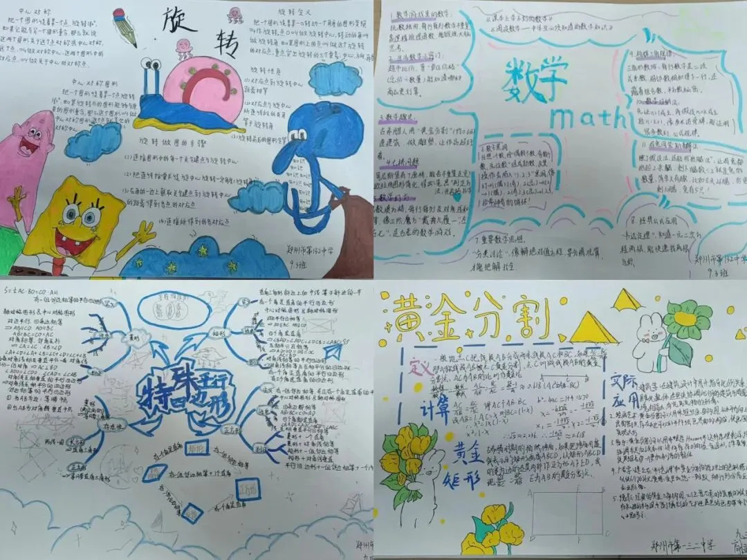 九年级数学特色作业以北师大版教材为依托,让学生自主选取喜爱单元绘制思维导图手抄报。学生积极参与,将零散知识点系统化、条理化,既巩固了数学知识,又锻炼了归纳梳理与审美创作能力。作业形式新颖有趣,有效激发学习主动性,实现知识梳理与素养提升的有机结合。