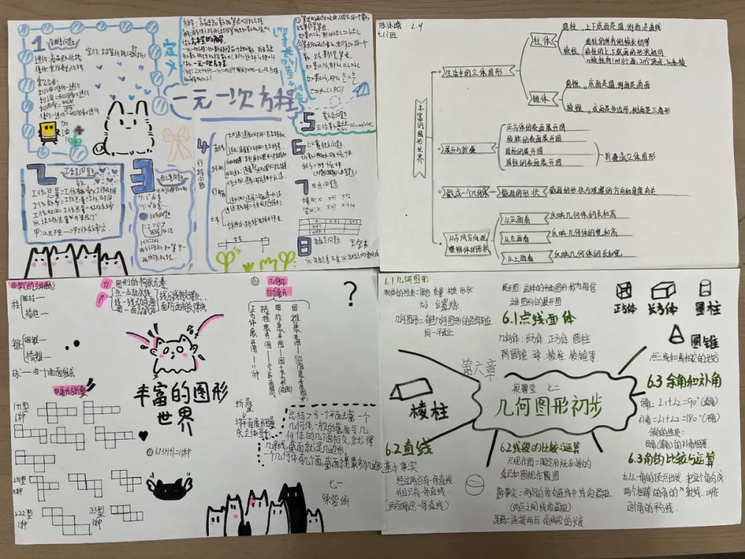 七年级数学学科寒假特色作业以思维导图和立体图形探究为核心。学生通过绘制思维导图,系统梳理旧知、构建知识体系,有效巩固所学内容;同时结合正方体、棱柱、棱锥等立体图形的展开图实践作业,强化空间想象与几何直观能力。作业兼具知识性与实践性,帮助学生在自主梳理与动手操作中提升数学素养,效果良好。