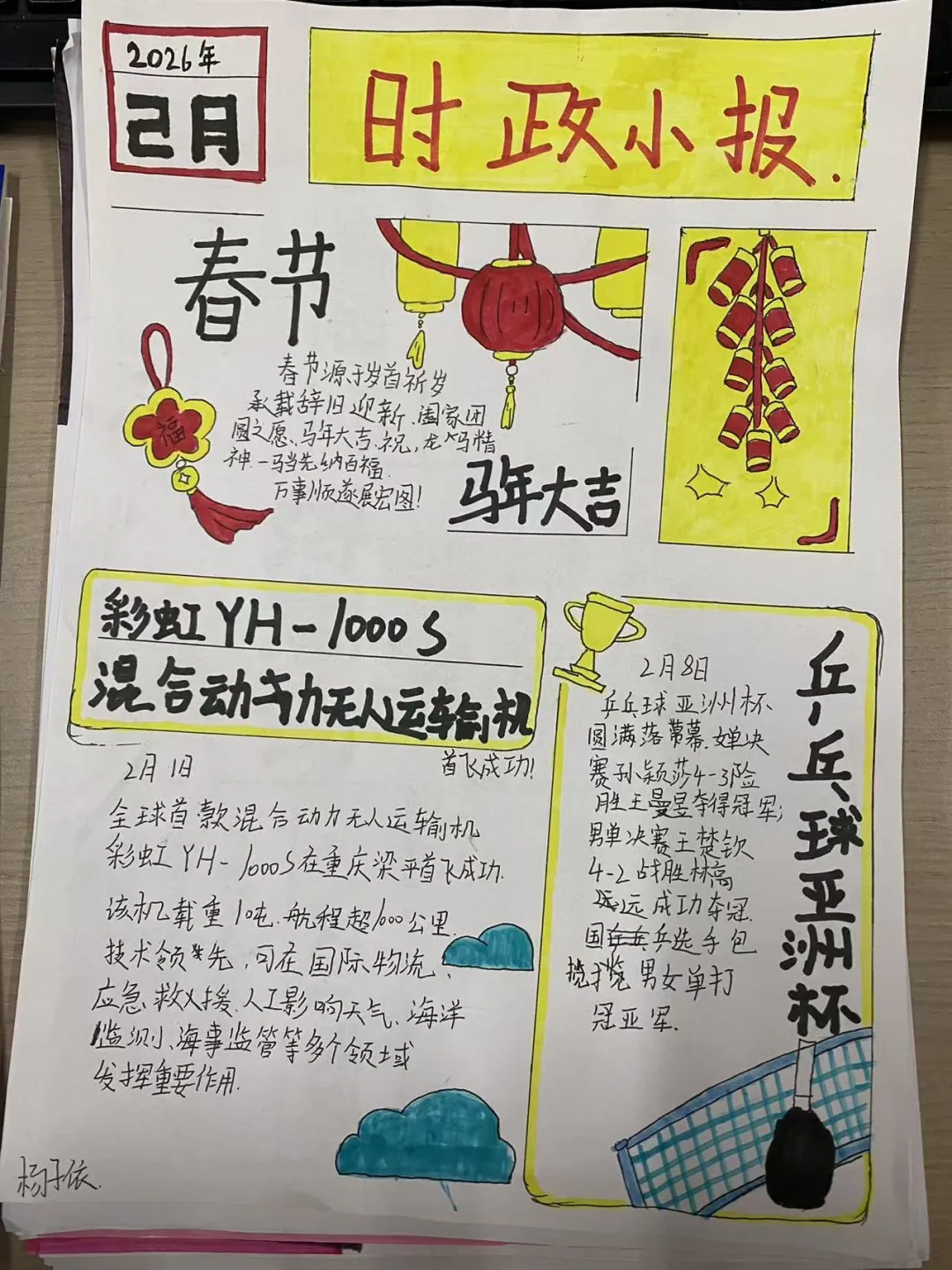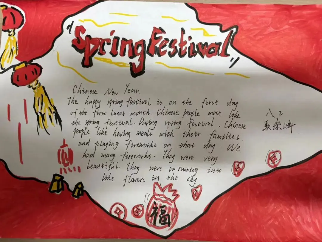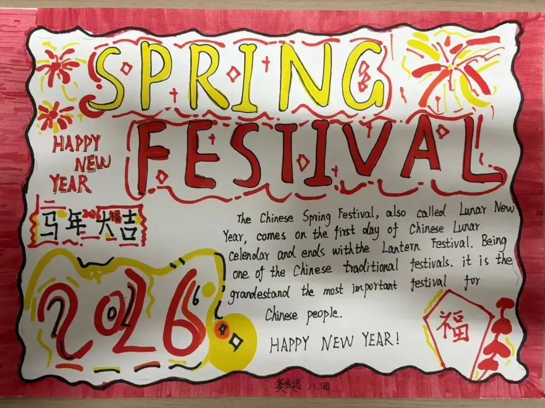 八年级寒假特色作业以“春节”为主题,同学们通过绘制手抄报的形式,展现中华传统节日文化。作品内容丰富、色彩鲜明,既有春节习俗、吉祥寓意,也有新年祝福与美好心愿。同学们在创作中感受年味、传承文化,既锻炼了审美与动手能力,也加深了对传统文化的理解与热爱,充分展现了积极向上的精神风貌。